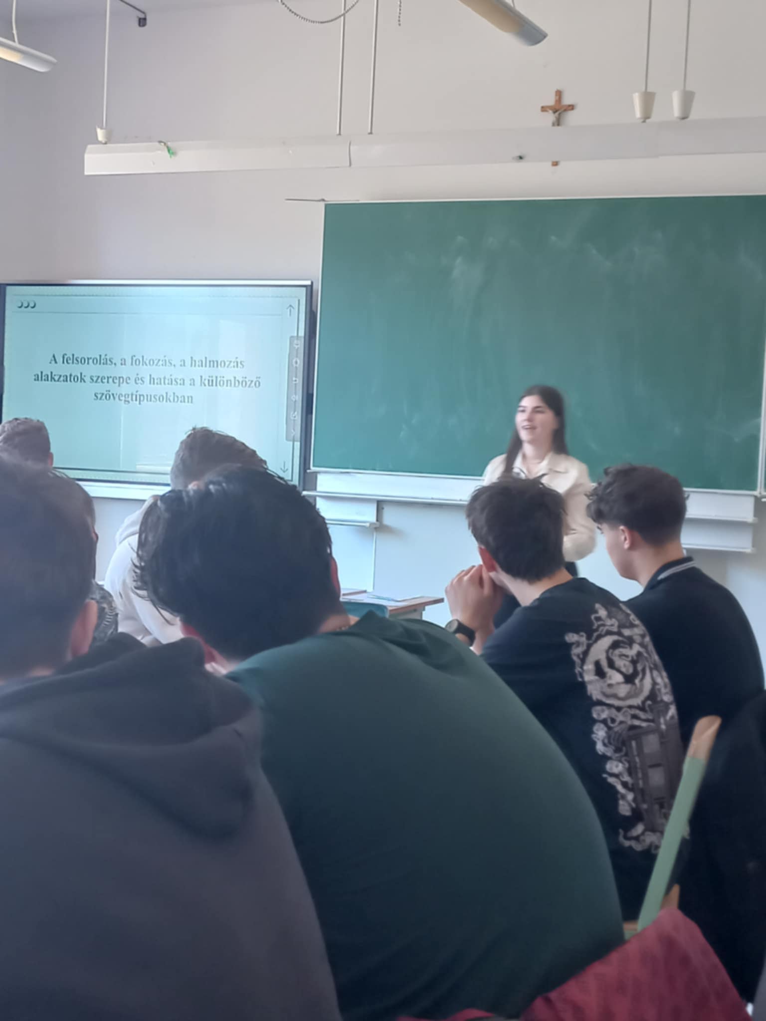 A háromnapos program során a szakmai előadások után az Eszterházy Károly Katolikus Egyetem gyakorló iskolájában (EKKE Gyakorló Általános Iskola, Közép-, Alapfokú Művészeti Iskola, Gimnázium, Alapfokú Művészeti Iskola és Technikum) tartották meg óráikat a versenyzők. Huzina Eszter a 16 fős 10. osztályban A felsorolás, fokozás, halmozás alakzatok szerepe és hatása a különböző szövegtípusokban címmel mutatta be óráját, melynek során változatos szövegtípusokon (népdal, archaikus ima, dalszöveg, szépirodalmi szövegek, publicisztikai szövegek, magánjellegű szóbeli és írott szövegek) keresztül sikerült a tanulókkal elsajátíttatnia az adott alakzatok fogalmát, funkcióit, a különböző szituációkban betöltött szerepét.