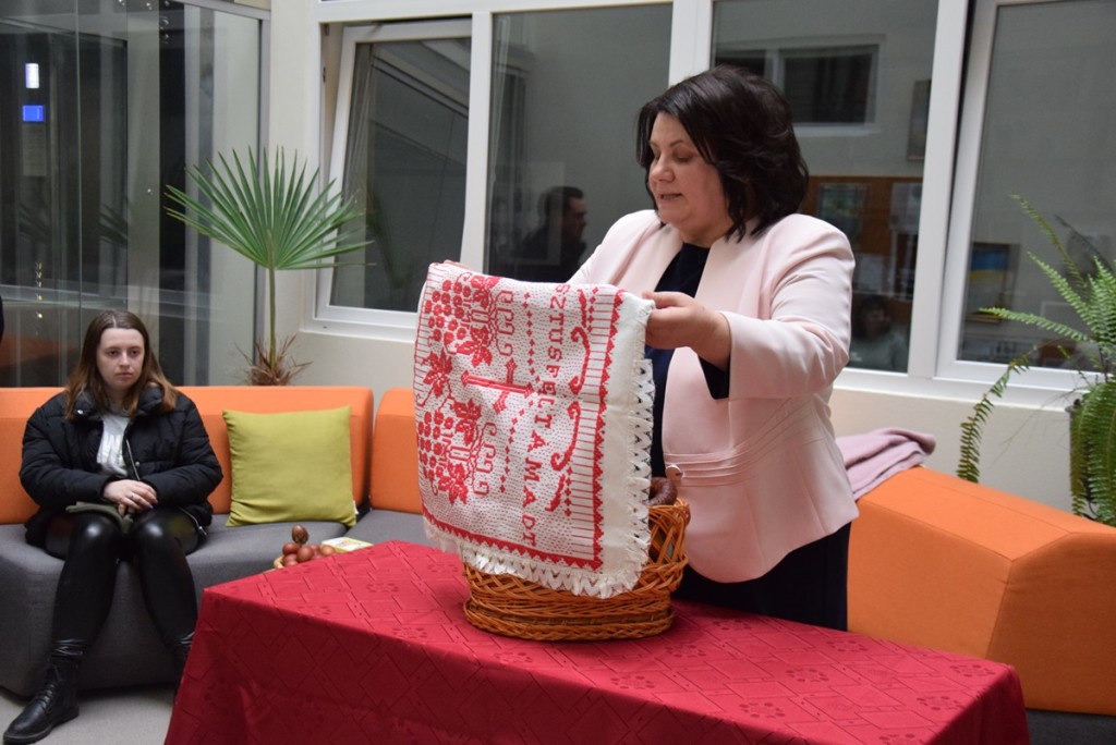 A Filológia Campus aulájában összegyűlteket Kész Margit, a Magyar Tanszéki Csoport docense köszöntötte. Örömét fejezte ki aziránt, hogy sokan megtisztelték jelenlétükkel a rendezvényt, hisz a Tanszék munkatársai arra törekedtek, hogy az érdeklődőket bevezessék a hagyományos húsvéti szokásokban. Ezt követően bemutatta a hagyományos szentelményi kosarat azokkal az ételekkel, melyeket megszentelésre vittek. Ezek közül is a legfontosabb a báránykára formázott vaj, a hímes tojás, a cékla, a torma, a bor, a sonka és kolbász, valamint a pászka, melyet kendővel, ún. pászkaterítővel takartak le. Megtudhattuk továbbá, hogy eleink az ételszentelést követően siettek is haza, hisz a néphit szerint a lemaradó még abban az évben meghal, míg az elsőnek hazaérő első lesz az aratásban.