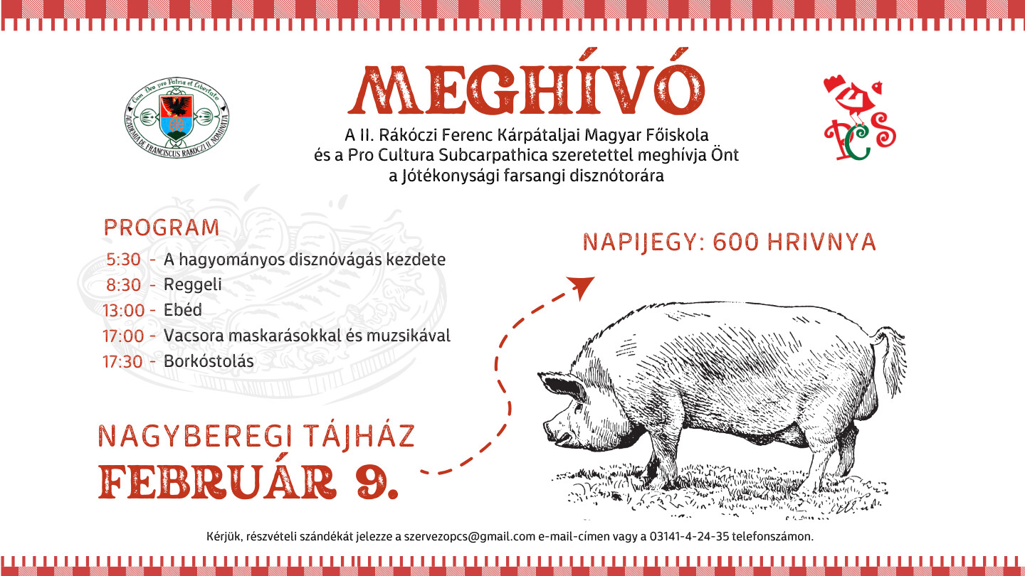 A II. Rákóczi Ferenc Kárpátaljai Magyar Főiskola és a Pro Cultura Subcarpathica civil szervezet jótékonysági farsangi disznótort szervez a Nagyberegi Tájházban február 9-én.