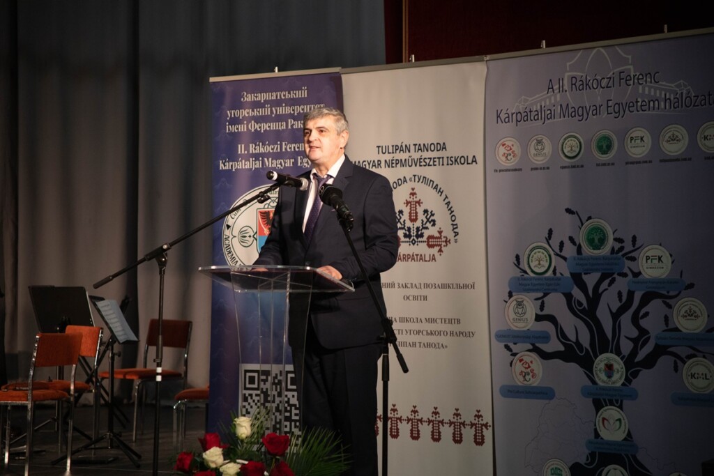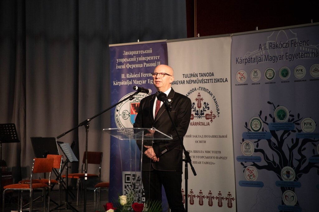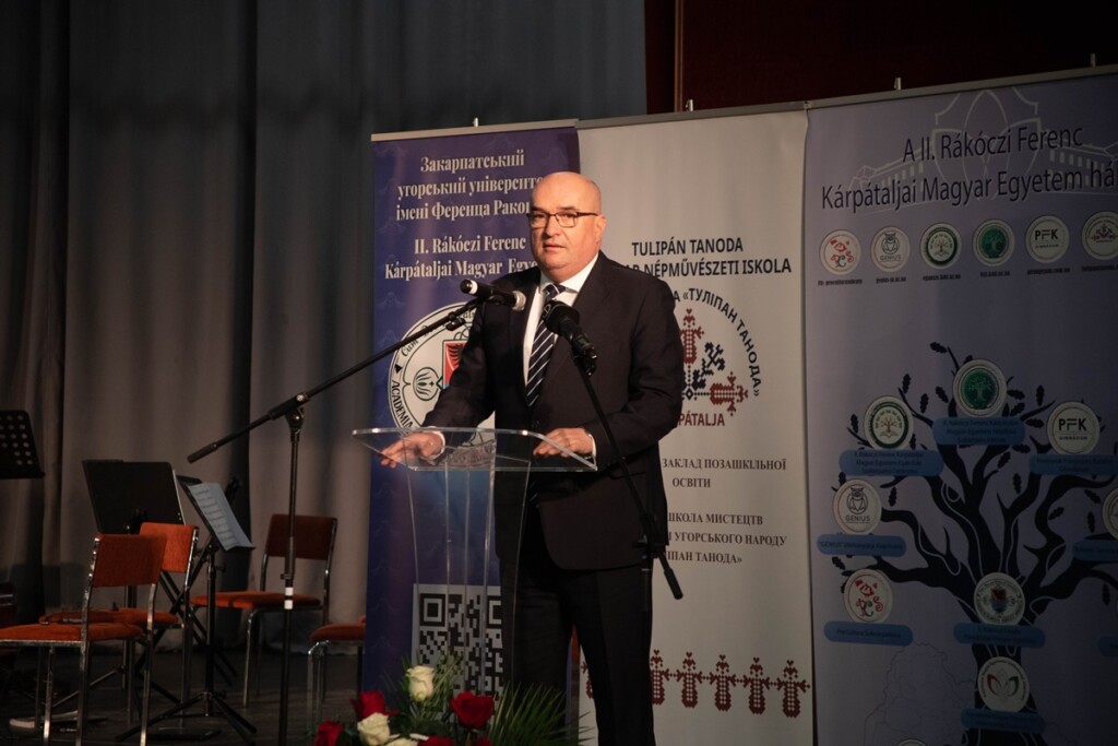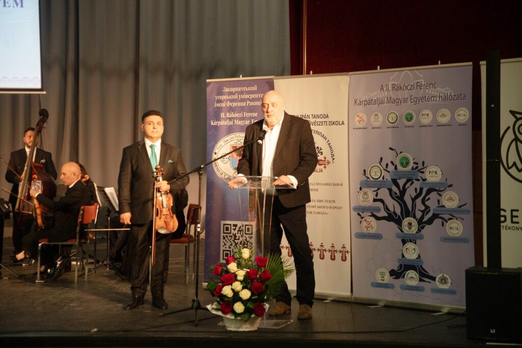 Őt követte Csernicskó István, a Rákóczi Egyetem rektora, aki bemutatta egyetemünket, perspektíváinkat. Kiemelte, hogy intézményünk ukrajnai bejegyzésű alapítványi felsőoktatási intézmény, amely 30 éve, 1996-ban kezdte meg önálló működését, 2001-ben került sor a főiskola első diplomaátadó ünnepségére, az elmúlt 30 évben 2867 személy összesen 4412 diplomát szerzett nálunk. Hallgatóink képzéséről összesen 172 oktató gondoskodik, tanáraink 73%-a rendelkezik tudományos fokozattal és 49%-a docensi vagy professzori címmel. Az első években 4 meghirdetett képzésünk volt, ma már 33 képzési programra hirdetünk felvételt. Egész Ukrajnában mi voltunk az első intézményi akkreditációval rendelkező felsőoktatási intézmény. 2025. október 1-jén pedig főiskolából egyetemmé váltunk, olyan oktatási intézményhálózat vagyunk, ahol az óvodától az egyetemig, sőt a felnőttképzésig és továbbképzésig kínálunk tanulási lehetőséget.