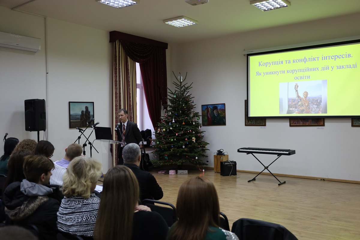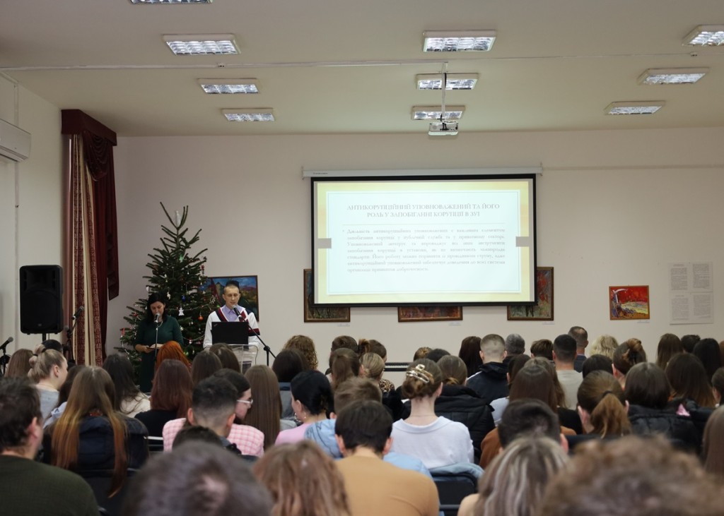 Az előadás során a hallgatóság megismerhette a korrupció megelőzéséért és feltárásáért felelős megbízott feladatait és munkáját, valamint Ukrajna korrupcióellenes jogszabályait. Külön rámutattak arra, hogy a hallgatók fontos szerepet játszanak a felsőoktatási intézményekben előforduló korrupció megelőzésében.