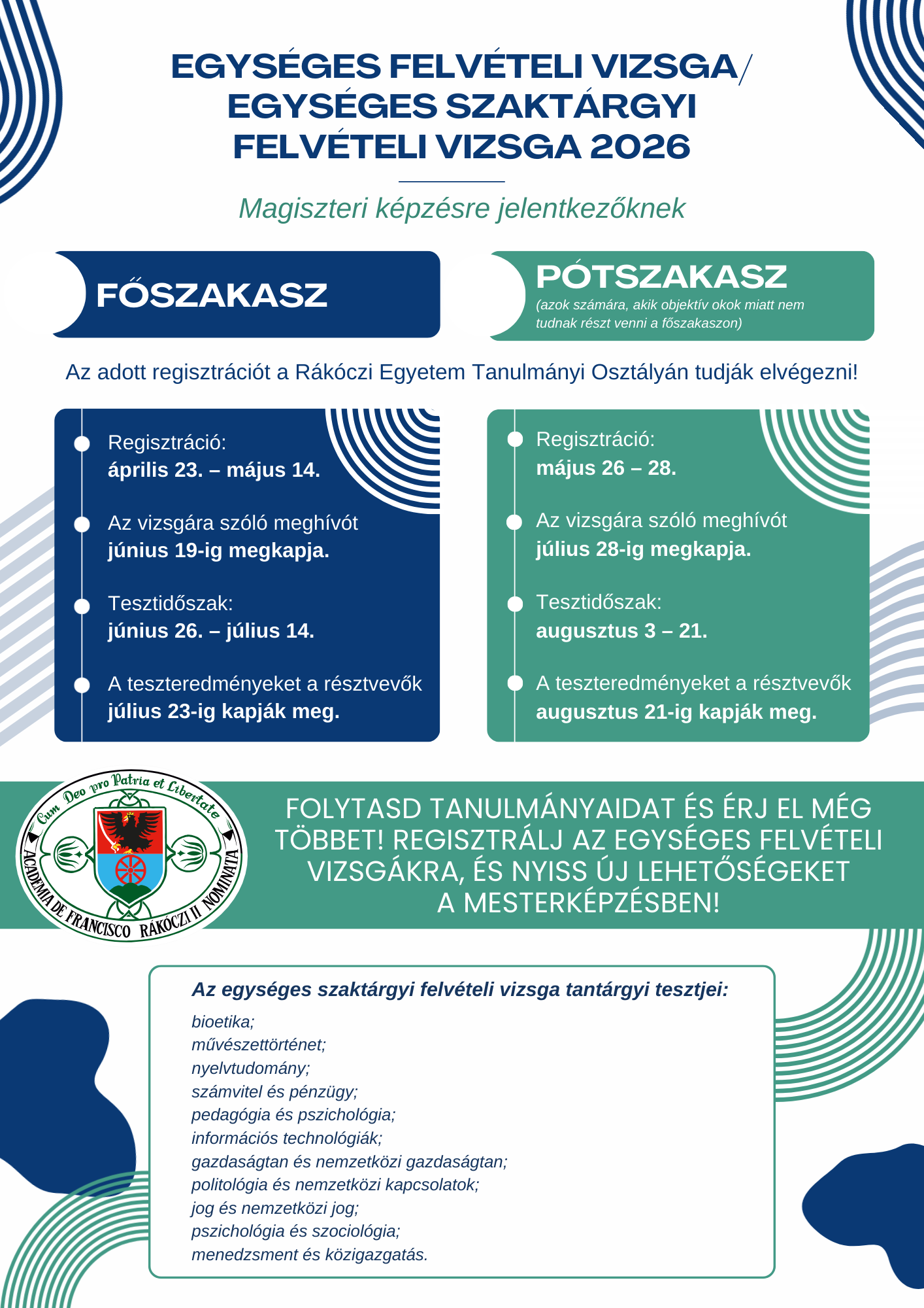 A főszakaszra a jelentkezési időszak 2026. április 23. és május 14. között zajlik. Ez idő alatt a jelentkezők a Rákóczi Egyetem Tanulmányi Osztályán regisztrálhatnak a vizsgára.