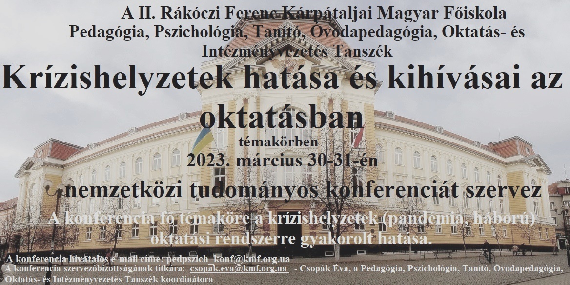 A II. Rákóczi Ferenc Kárpátaljai Magyar Főiskola Pedagógia, Pszichológia, Tanító, Óvodapedagógia, Oktatás- és Intézményvezetés Tanszéke Krízishelyzetek hatása és kihívásai az oktatásban témakörben 2023. március 30–31-én nemzetközi tudományos konferenciát szervez.