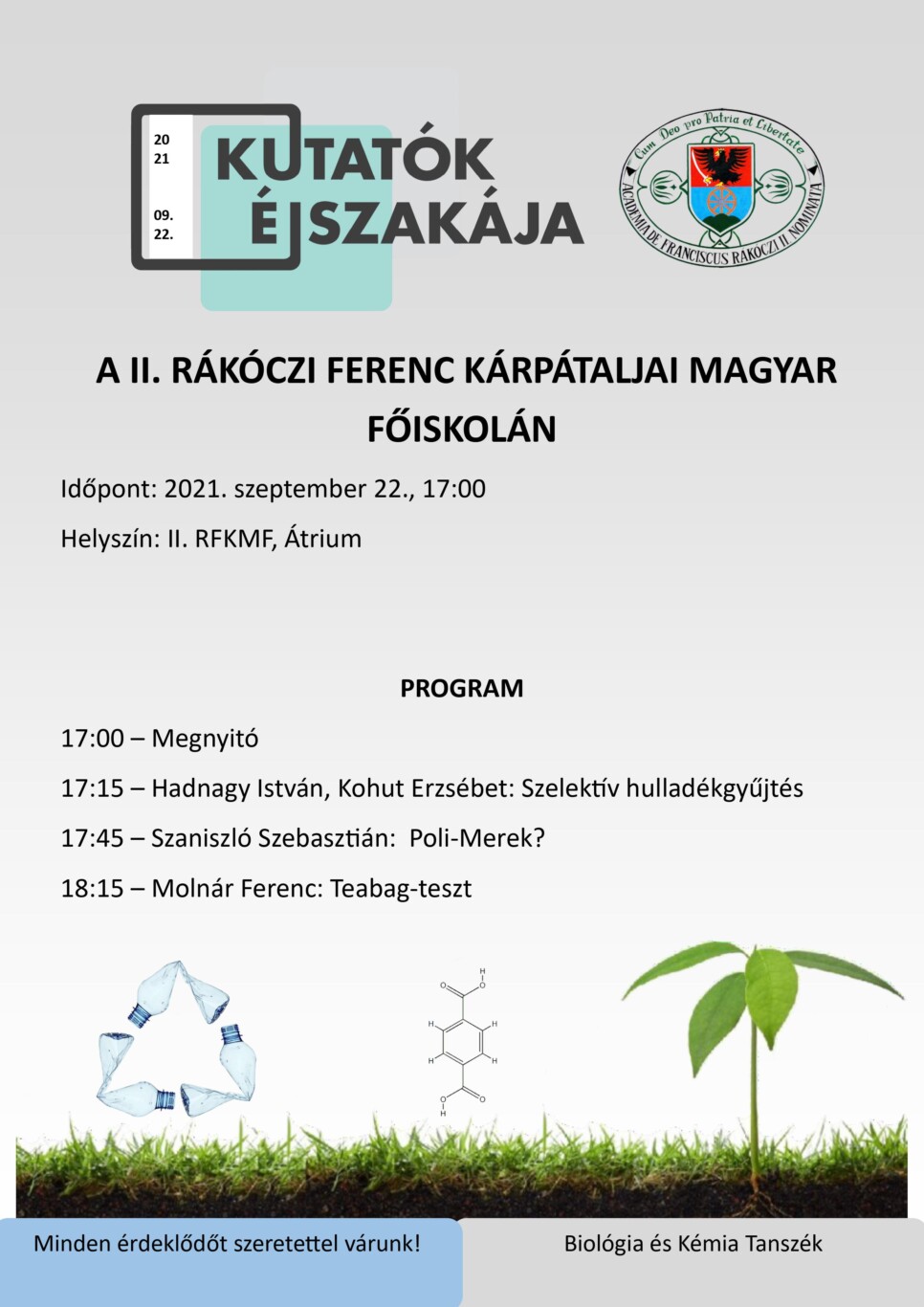 A Biológia és Kémia Tanszék 2021-ben is megszervezi a Kutatók Éjszakája programját, melynek idei témája a műanyag hulladékok kérdése lesz. A rendezvényre 2021. szeptember 22-én 17.00 órától kerül sor a főiskola átriumában.
