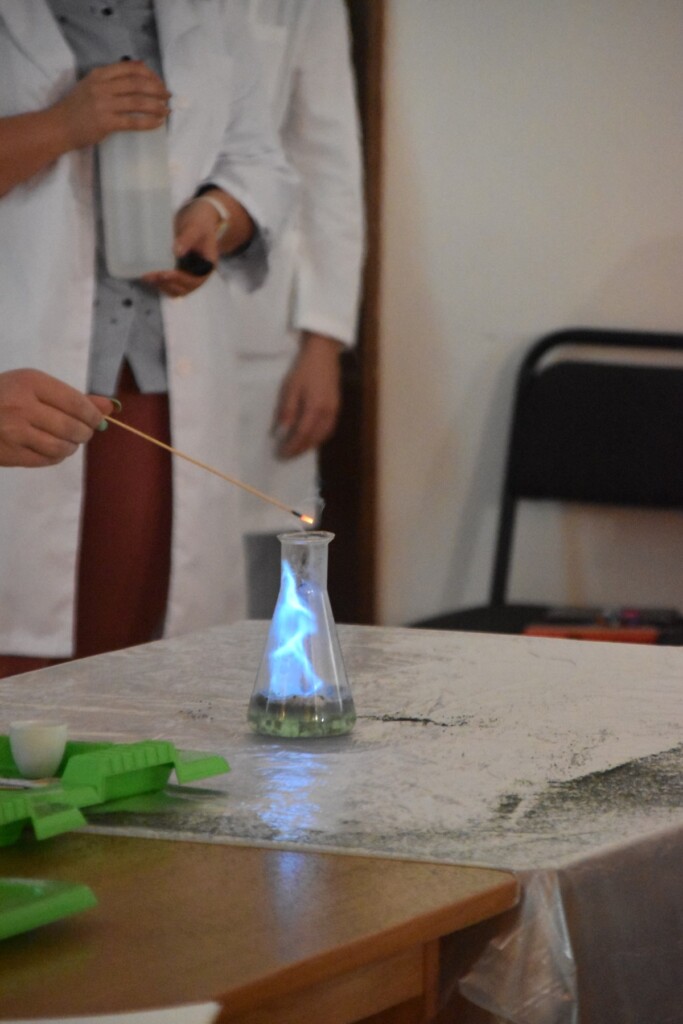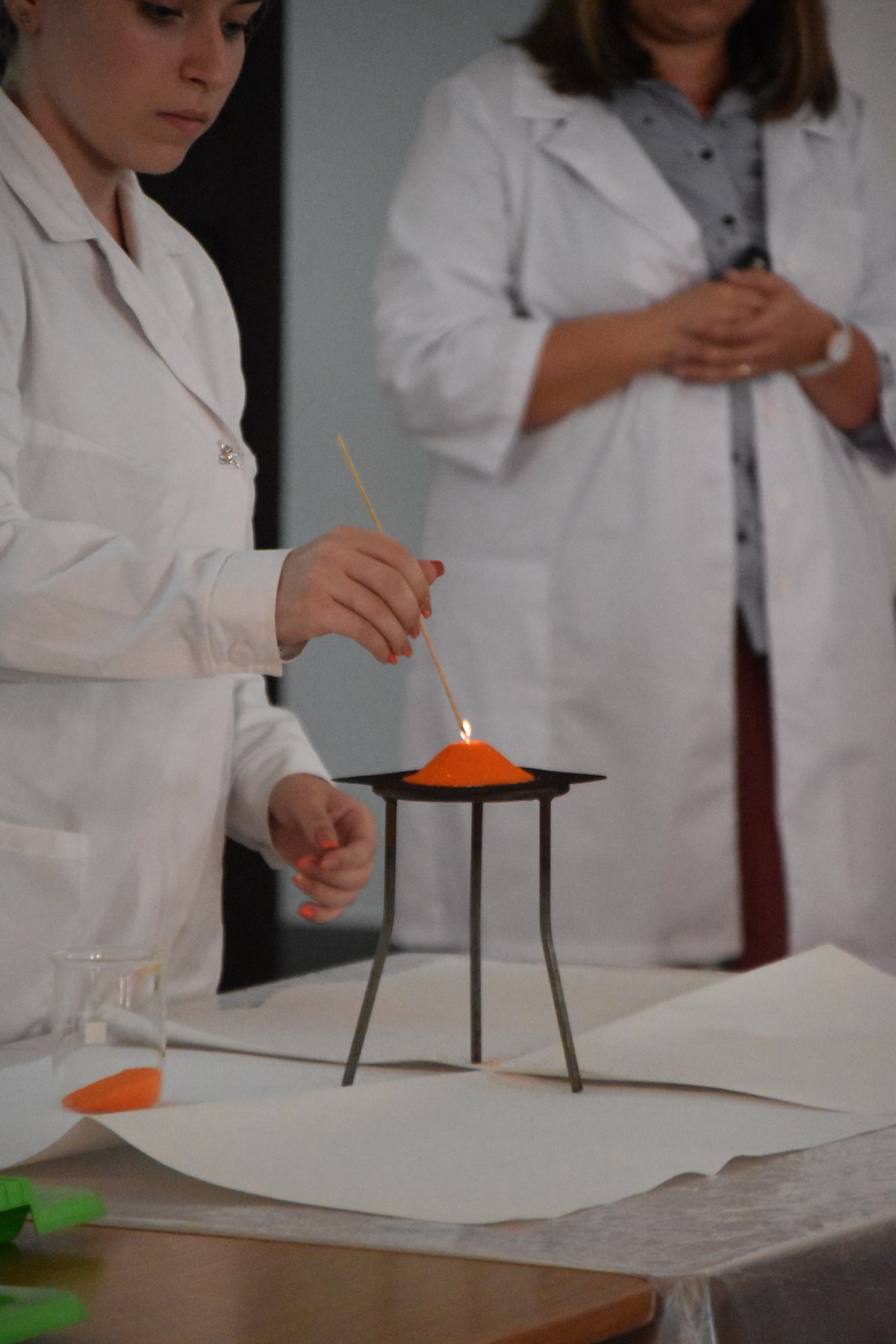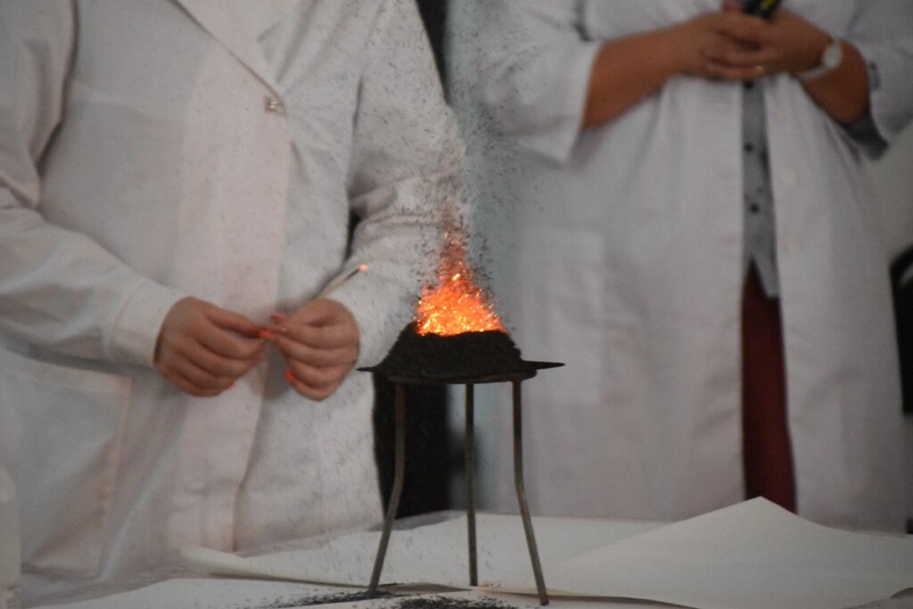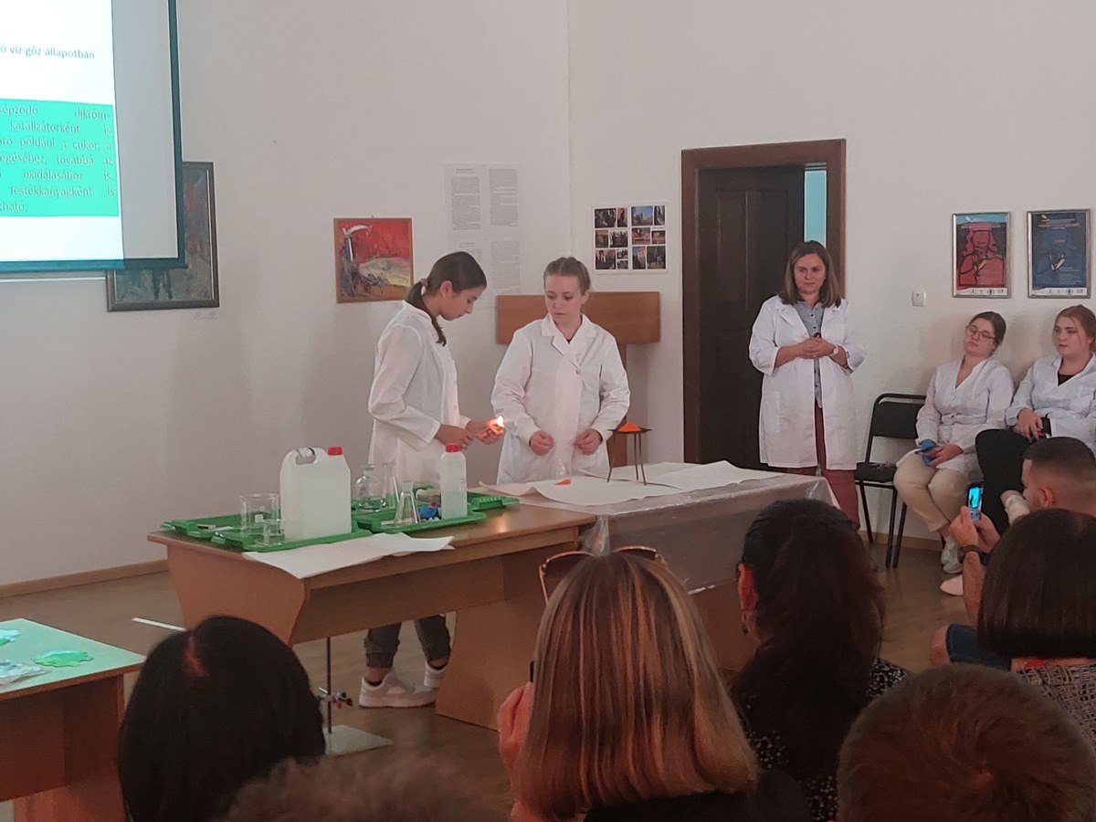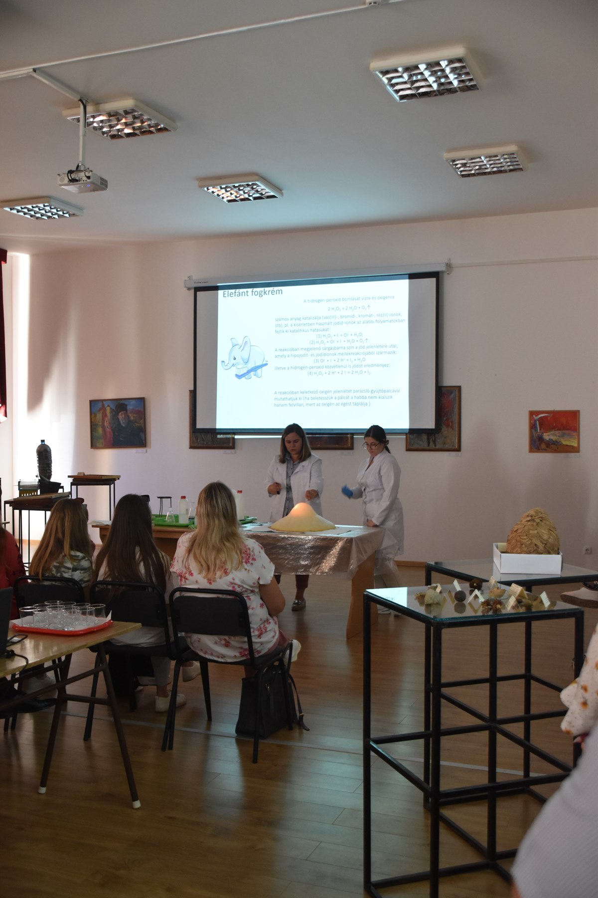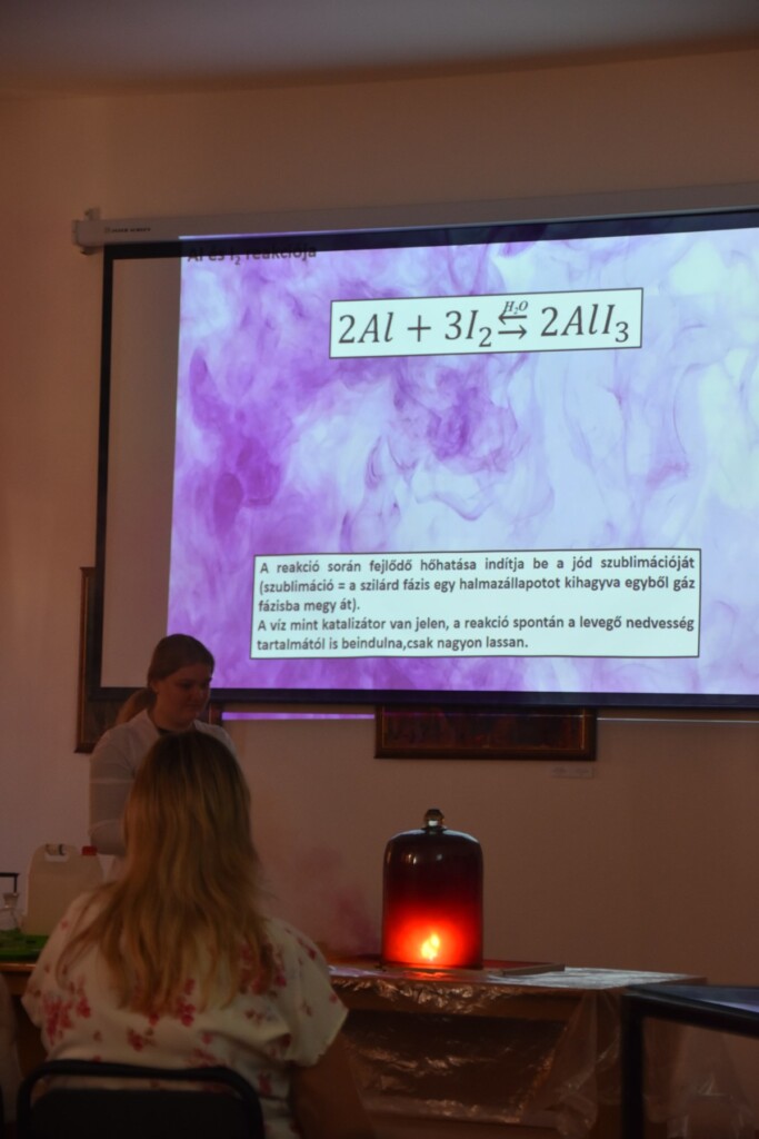 Idén sem maradhatott el az évek óta nagy népszerűségnek örvendő látványos kémiai kísérletek bemutatása. Kémikus hallgatóink demonstrálták a kisvulkán reakciót (exoterm reakció), durranó gázt fejlesztettek (hidrogén és oxigén 2:1 arányú keveréke), sarki fényt modelleztek, előállították az elefánt fogkrémet (melyben parázsló gyújtópálca segítségével mutatták ki az oxigént), valamint lila gőzt (jód szublimáció) állítottak elő.
