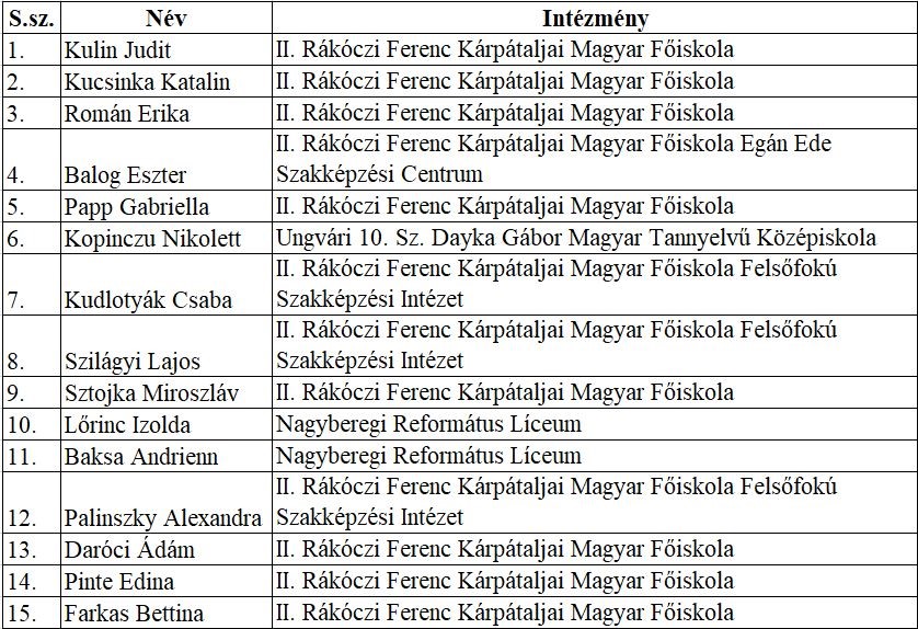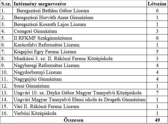 A képzésre a Kárpátaljai Magyar Pedagógusszövetség által megvalósított Terebesi Viktor Emlékverseny (5-6. osztályban tanulók számára) és a Geőcze Zoárd Matematikaverseny (7-11. osztályban tanulók számára) első tíz helyezettjei kaptak névre szóló meghívót, összesen 56 tanuló. A meghívottakból 49 gyerek vett részt a foglalkozásokon, akik Kárpátalja alábbi oktatási intézményeit képviselték: