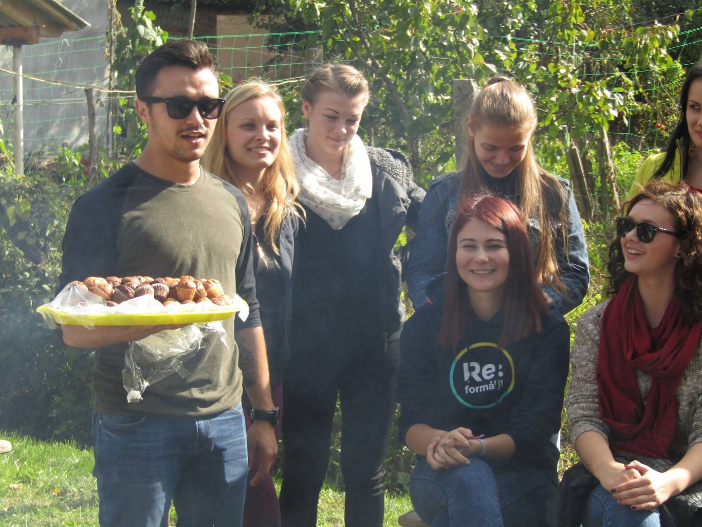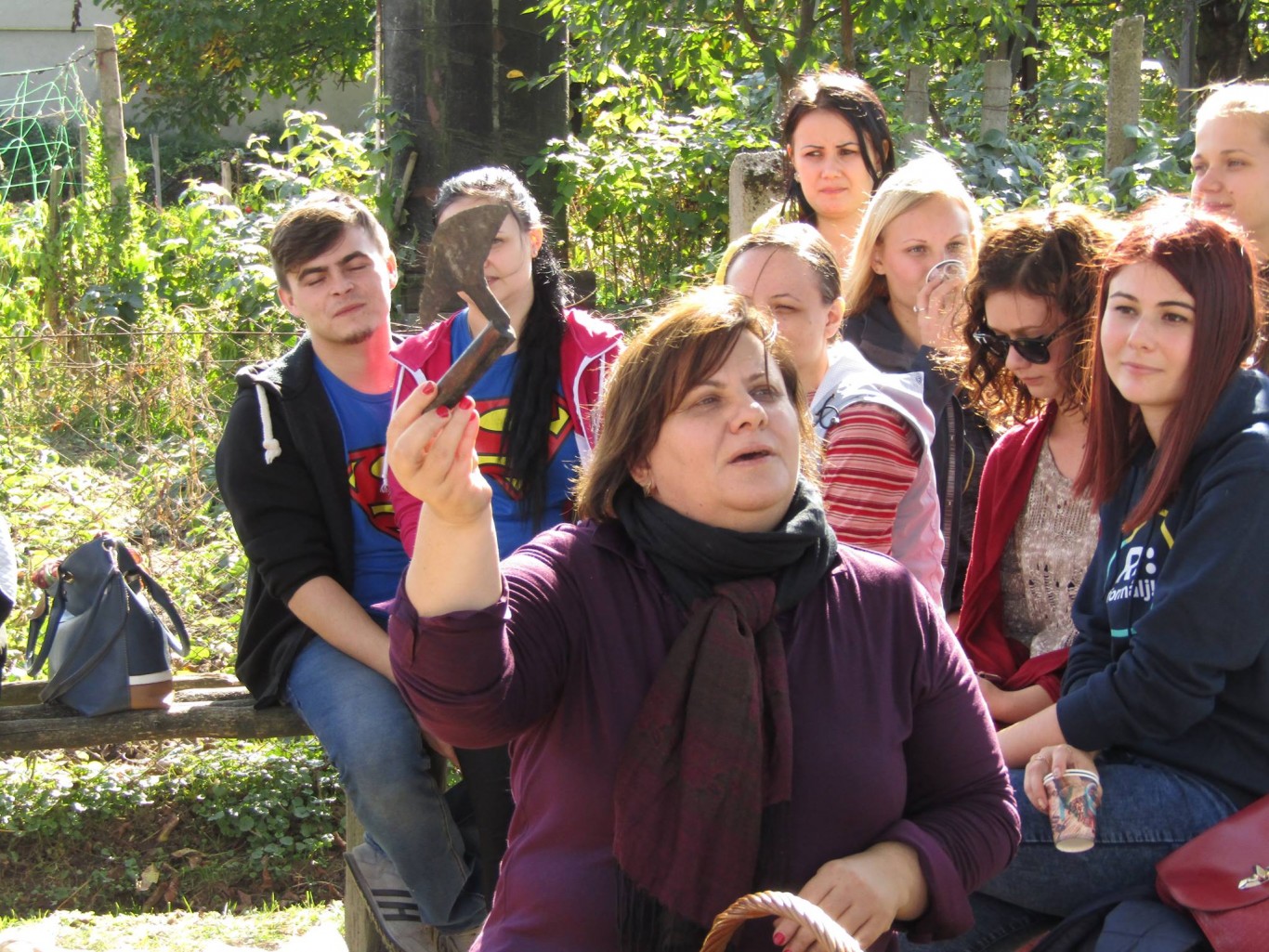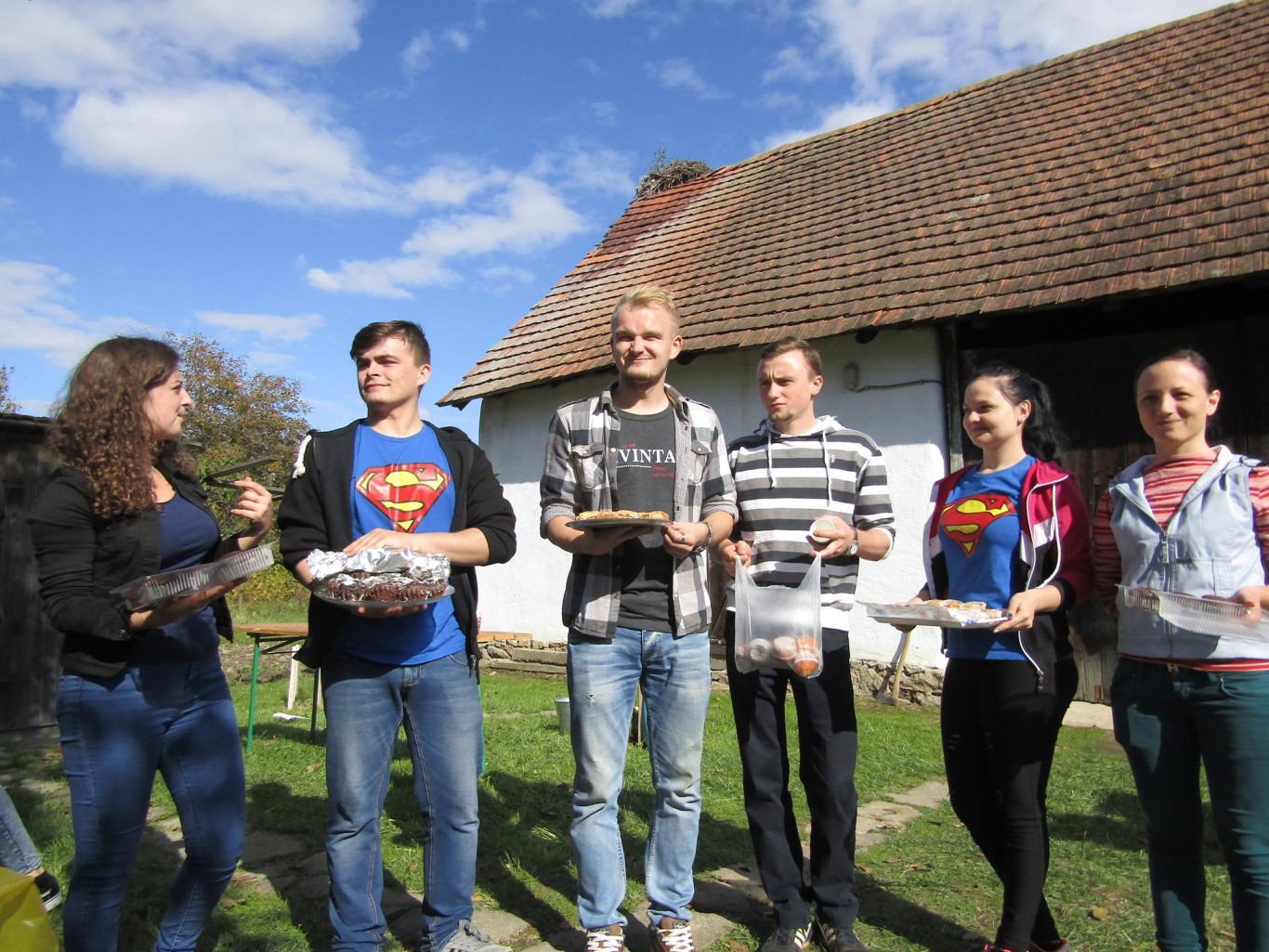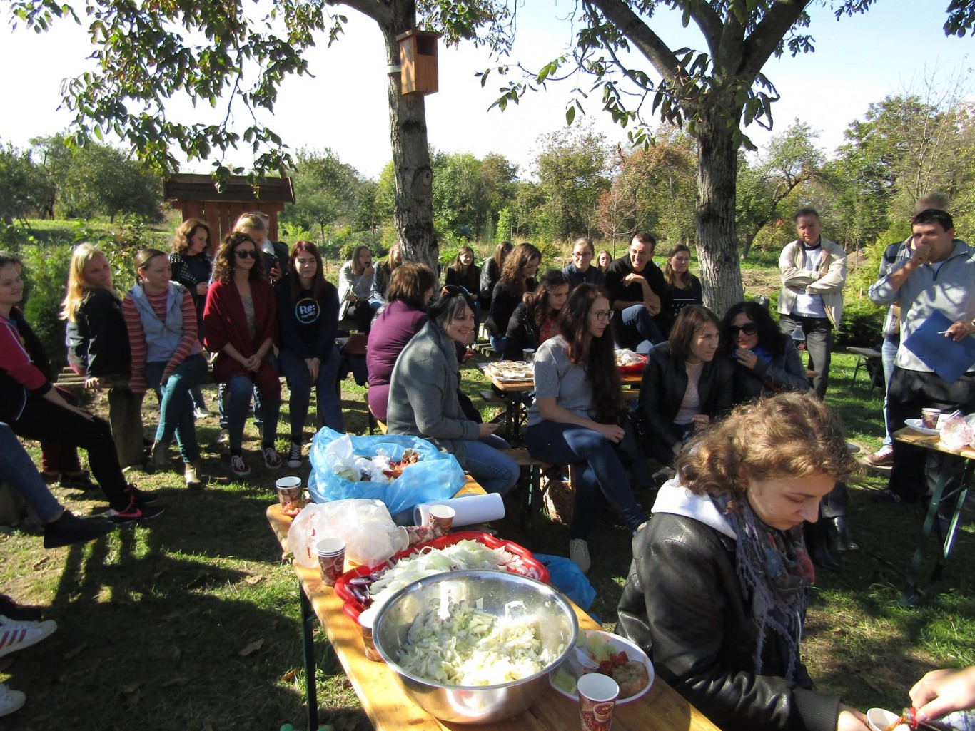 A szaknapon az I-V. évfolyamos magyar szakos hallgatók, illetve a Tanszék munkatársai szép számban képviseltették magukat. A közel 60 fős társaság hamar megtalálta a közös hangot és az első közös feladatot is: az út során támadt éhség csillapítására szolgáló falatok elkészítését, melyek a napsütéses, de azért már őszies idő miatt, a meleg tea kíséretében gyorsan el is fogytak. Némi beszélgetés és pihenő után a társaság nekilátott a fő fogás előkészítésének. A diáklányok szorgos munkájának köszönhetően gyorsan megteltek a tálak ízletes zöldségsalátával, a tálcák pedig a friss kenyérrel. Persze azért a férfinépnek is akadt tennivalója. Ők a tűzrakás és a sütnivaló dolgok előkészítésén fáradoztak. A jól szervezett munka eredményeképp gyorsan a tűz fölé kerültek az első nyársak. Az ízletes házi szalonna és füstölt kolbász illata gyorsan belengte a Tájház kis kertjét, s a tűz köré csalogatta azokat is, akik elsőre ódzkodtak a sütögetés gondolatától. A finom falatok láttán kézről kézre jártak a nyársak, mindenki igyekezett a saját szája íze szerint elkészíteni az ebédül szolgáló sülteket. Az elkészült finomságokat jóízű beszélgetés kíséretében fogyasztotta el mindenki.