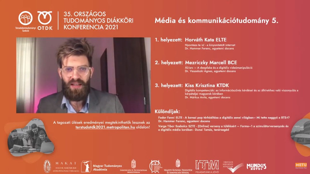 A Budapesti Metropolitan Egyetemen megrendezett Társadalomtudományi szekció Média és kommunikációtudomány 5. nevű alszekcióban Kiss Krisztina (vezetőtanára Dr. Márku Anita) Digitális kompetenciák: az információszűrés kérdései és az álhírekhez való viszonyulás a kárpátaljai magyarok körében című előadásával 3. helyezést ért el.