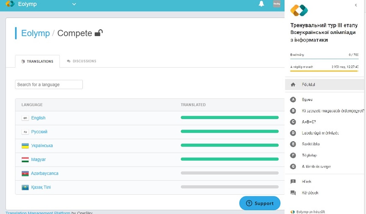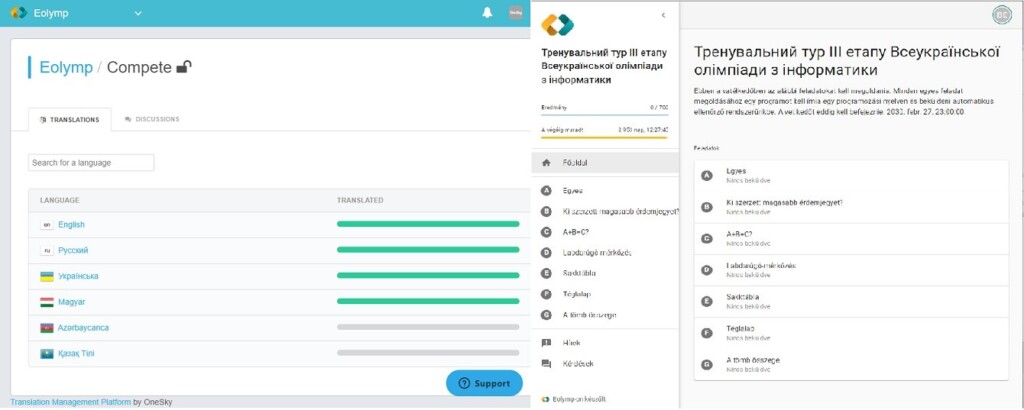 Dr. Mica Oleksandr, az Ungvári Nemzeti Egyetem oktatója közreműködésével sikerült hozzáférést nyernünk az Eolymp fordító felületéhez. Beregszászi István, a Rákóczi-főiskola oktatója, valamint Temető Ádám és Palinszky Alexandra matematika szakos hallgatók segítségével a felület nagyrésze már magyarosítva lett.