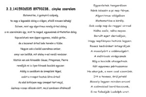 Mindeközben a Pi-nap alkalmával meghirdetett versíró versenyen is kiemelkedően vettek részt. Beküldésre kerültek egyéni és csoportos munkák egyaránt. Mindkét kategóriában dicséretre méltó művek születtek. Ezután a közösségi hálón mérettettek meg a munkák, ahol a legtöbb kedvelést a csoportos kategóriában a bachelor szintű képzésen tanuló első évfolyamos hallgatók szerezték, egyéniben pedig Szenykó Anasztázia, második évfolyamos hallgató nyerte el.