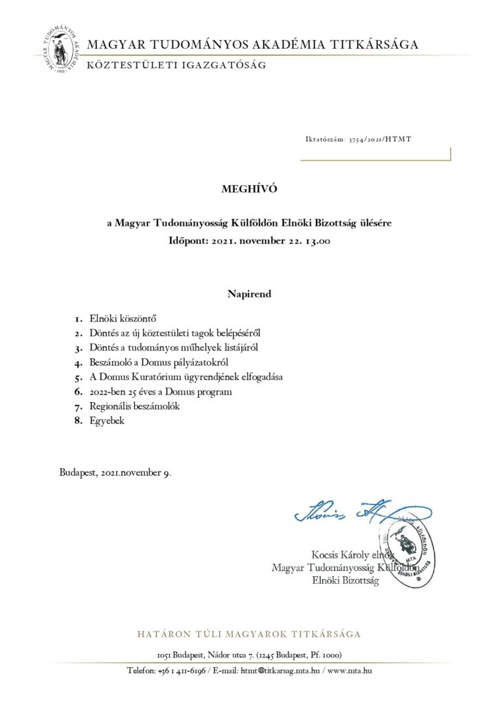 December 6-án tartotta soron következő ülését a Magyar Tudományos Akadémia (MTA) Magyar Tudományosság Külföldön Elnöki Bizottság (MTK EB).