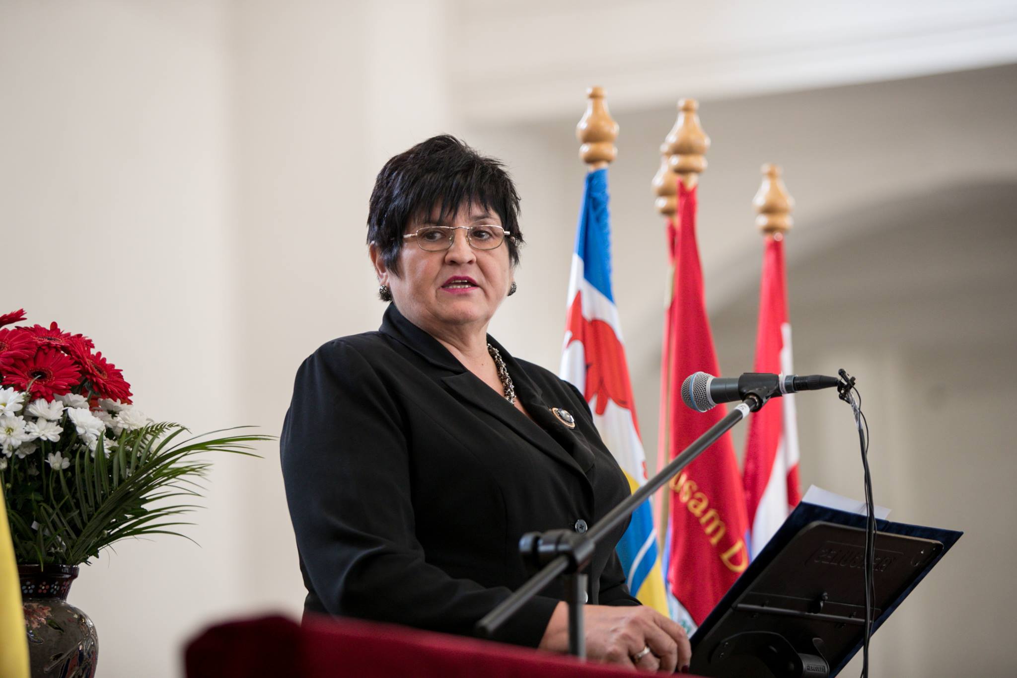 Orosz Ildikó, a II. RF KMF rektora tanévnyitó beszédében köszönetet mondott mindazoknak, akik a nyár folyamán munkájukkal hozzájárultak ahhoz, hogy gördülékenyen kezdődhessen az új tanév. Beszédében elmondta, hogy a 2017/18-as tanévet összesen 1224 hallgató kezdte meg az intézmény különböző képzési szintjein. Az eredményes nyár után a kisebbségi oktatást elsöprő, hirtelen keletkezett viharral érkezett meg az ősz. Mint derült égből a nem várt mennykőcsapás, úgy sújtott le a magyar nyelvű oktatási rendszerre az új oktatási törvény 7. cikkelye. A törvény megszünteti a teljes körű anyanyelvi oktatás lehetőségét, és korlátozza az elemi oktatást. A rektor asszony a súlyos tankönyvhiányra is felhívta a figyelmet. Némi megnyugvást jelent, hogy a megyei tanács abszolút többséggel fogadta el, hogy kérjék Petro Porosenkót, ne írja alá az új oktatási törvényt. Immár nem 64 ezer ember kéri a törvény megvétózását, hanem félmillió embert képviselő megyei testület. Kiemelte, hogy Brenzovics László kivételével a kárpátaljai honatyák közül senki sem szavazott nemmel az oktatási törvényt illetően. Beszédében arra is rávilágított, hogy Lilija Hrinevics ukrán oktatásügyi miniszter több meghívásra sem jött el Kárpátaljára, ahogy a tanévnyitó ünnepséget sem tisztelte meg jelenlétével. Ebből is kiolvasható, hogy nem akarnak tárgyalni, nem akarnak kompromisszumot kötni. Levonható a következtetés, hogy magunk maradtunk, mi magyarok. Mindent meg kell tennünk annak érekében, hogy visszakapjuk alkotmány által biztosított jogainkat az anyanyelvi oktatás és az anyanyelv használata terén. Amennyiben az ukrán elnök aláírja a szégyenletes törvényt, lesz egy kis átmeneti időszakunk. Ezt kell racionálisan felhasználni. Mindenki végezzen lelkiismereti vizsgálatot, és cselekedjen saját érdekében a nemzete javára – hangsúlyozta Orosz Ildikó.