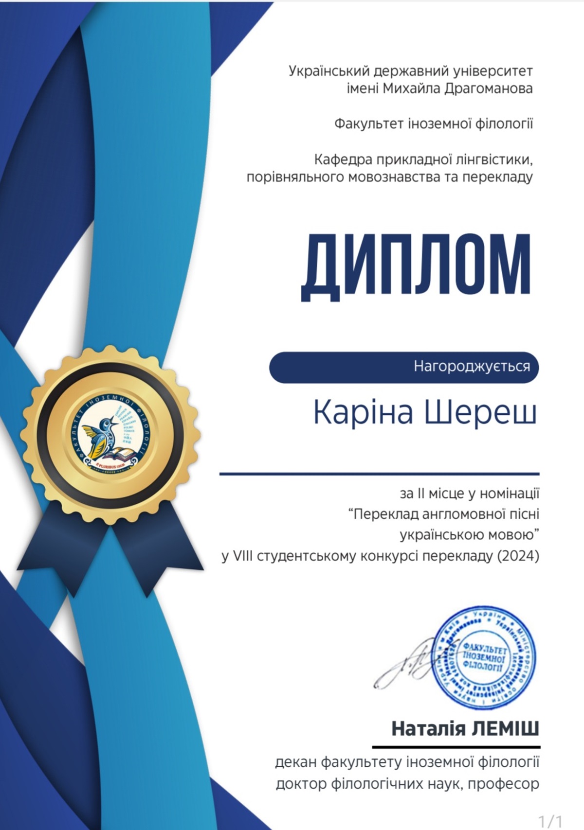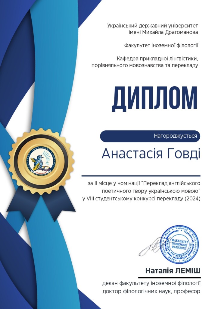 2024. március 28-án a Drahomanov Nemzeti Pedagógiai Egyetem Idegen Nyelvi Bölcsészkarának Alkalmazott Nyelvészeti, Összehasonlító Nyelvészeti és Fordítás Tanszéke kihirdette a már nyolcadik alkalommal megrendezett A fordítás mint a világ nyelvi képe aktualizálásának eszköze nevű nemzetközi diákfordítói verseny győzteseit.
