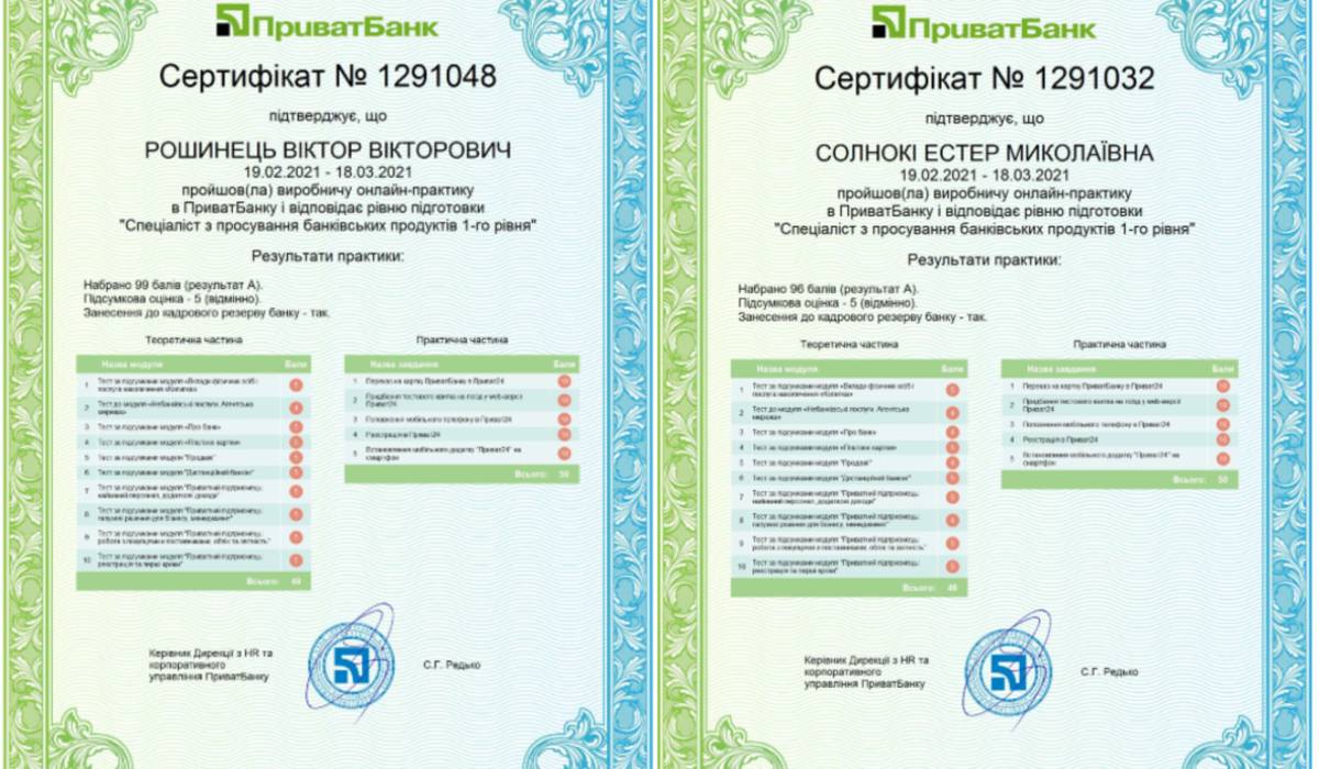 A II. Rákóczi Ferenc Kárpátaljai Magyar Főiskola számvitel és adóügy szakos hallgatói a program teljesítését követően tanúsítványt kaptak „Első szintű szakember a banki termékek promóciójában” címmel. A sikeres szakmai gyakorlat után a legjobban teljesítő hallgatóknak lehetőségük van a Privat Bank Zrt.-nél dolgozni.