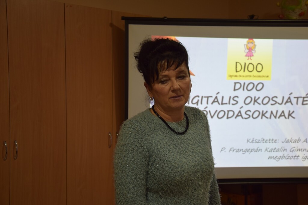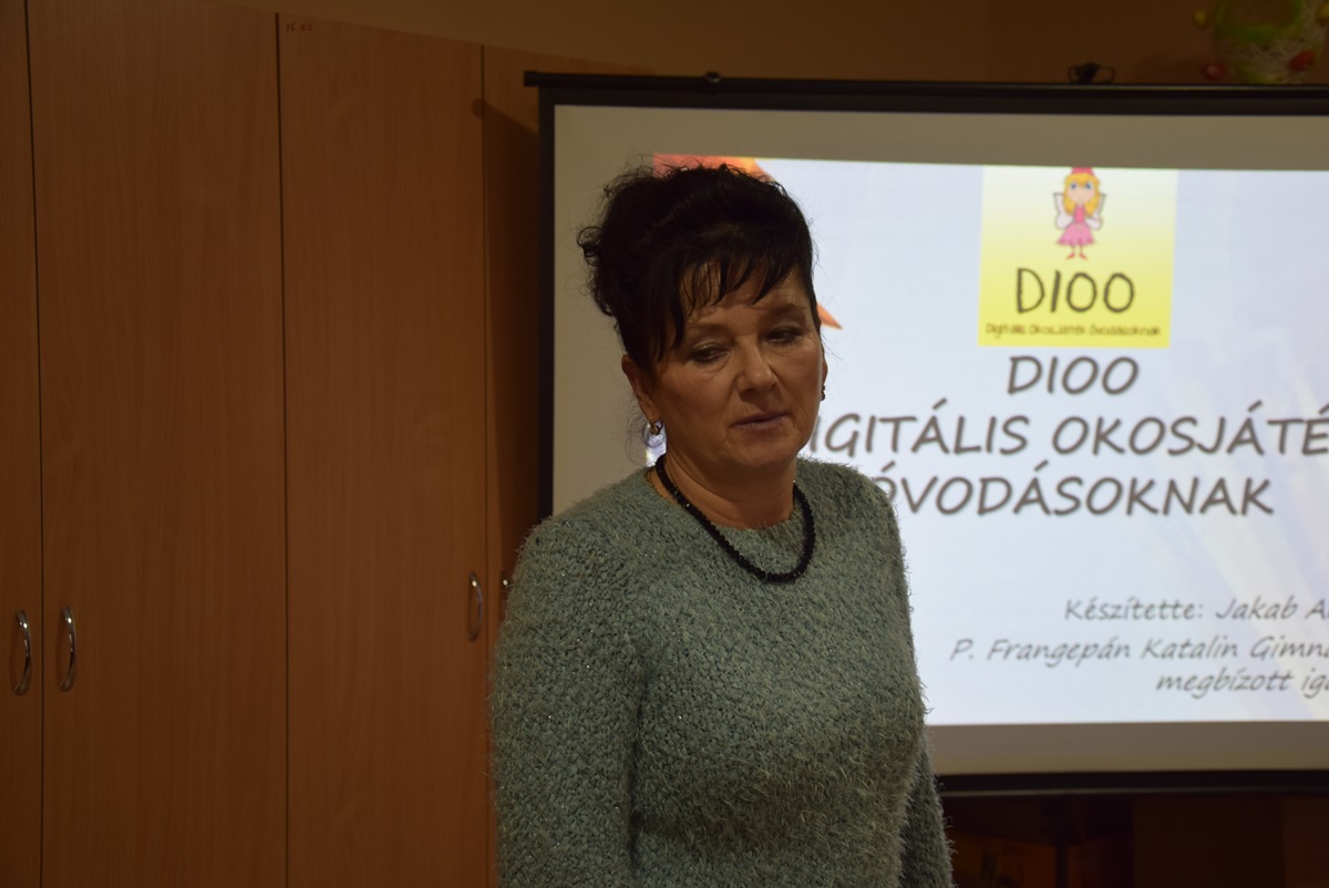 Ezt követően Jakab Andrea, a P. Frangepán Katalin Gimnázium megbízott igazgatója mutatta be a DIOO programot. Megtudhattuk, hogy a program az óvodás korosztály életkori sajátosságainak és igényeinek megfelelő, képességfejlesztést célzó feladatokat tartalmaz. A DIOO 16 képességterületet fejleszt és mér 16 játékba csomagolva, 2234, fokozatosan nehezedő játékkal. A mesevilág színei elvarázsolják a gyermeket, s így játszva fejlődik. Az eszköz ajánlott napi használata 15 perc. A játékok a gyermekek érdeklődésére építenek, s sikerélményt motiváló hatása ösztönzi a problémamegoldást.