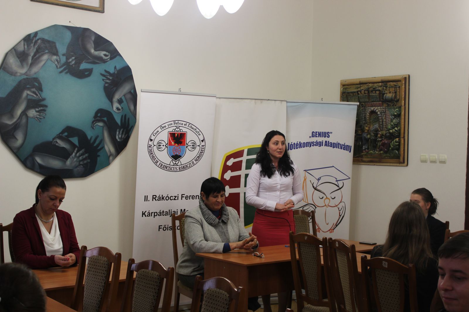 A továbbiakban Orosz Ildikó, a II. RF KMF rektora üdvözölte a jelenlévőket, majd az ösztöndíjprogram névadójára, Soós Kálmánra emlékezett, aki fiatal tudósként nagyon sokat tett a tudomány, a Rákóczi Főiskola és a felnövekvő nemzedék érdekében. Továbbá rektorasszony rávilágított arra, hogy nekünk van egy hivatásunk Kárpátalján, egy feladatunk, hogy helyi tematikájú kutatásokat végezzünk… Ezért is jött létre a „GENIUS” Jótékonysági Alapítvány, hogy a tehetséggondozás területén munkálkodjon. A fő vezérelv az volt, hogy a Kárpátalján tevékenykedő, Kárpátalját kutató fiatalokat támogassák munkájukban.