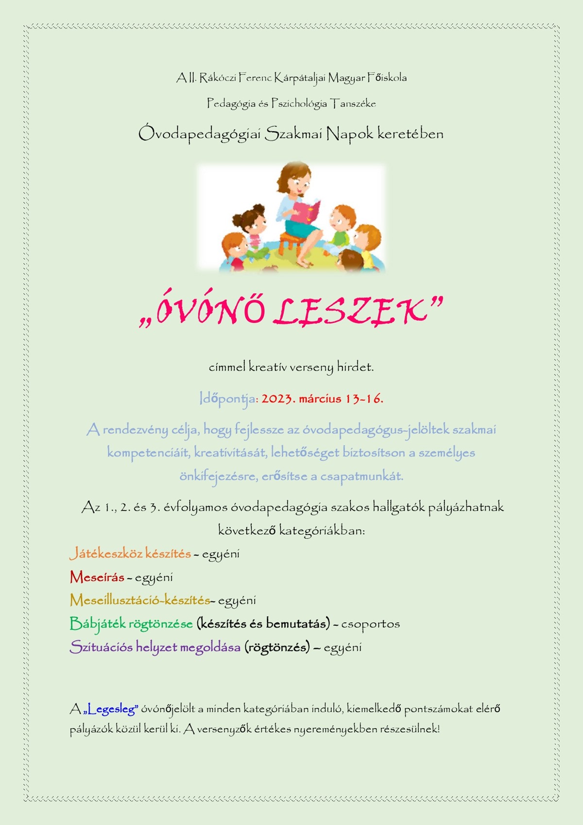 A Pedagógia, Pszichológia, Tanító, Óvodapedagógia, Oktatás- és Intézményvezetés Tanszék szervezésében Óvodapedagógai Szakmai Napokra kerül sor március 13-16. között. Ennek keretében „Óvónő leszek” kreatív versenyt hirdettek óvodapedagógus hallgatók számára.