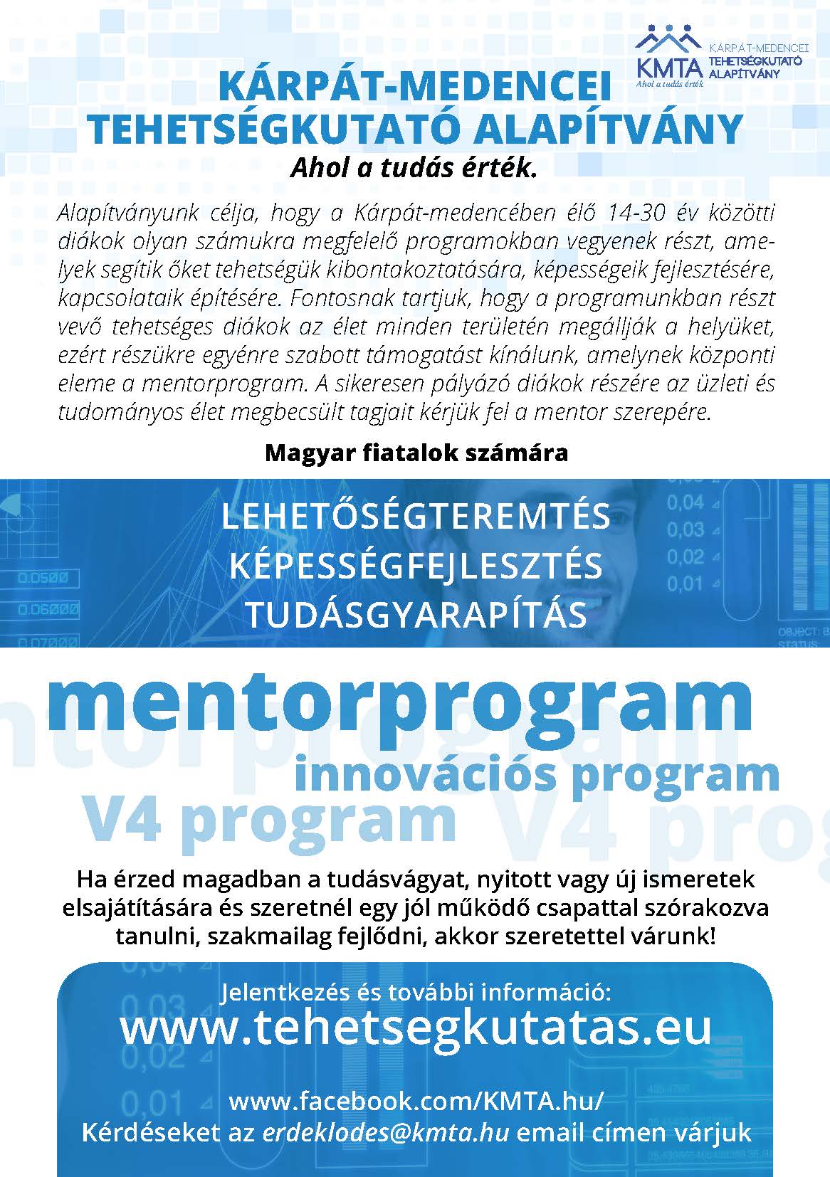 A Kárpát-medencei Tehetségkutató Alapítvány tehetségeket támogató programja első lépéseként várja olyan, Kárpát-medencei, kiemelkedő tehetségű, 14 és 30 év közötti, nappali tagozatos képzésben résztvevő fiatalok jelentkezését, akik: