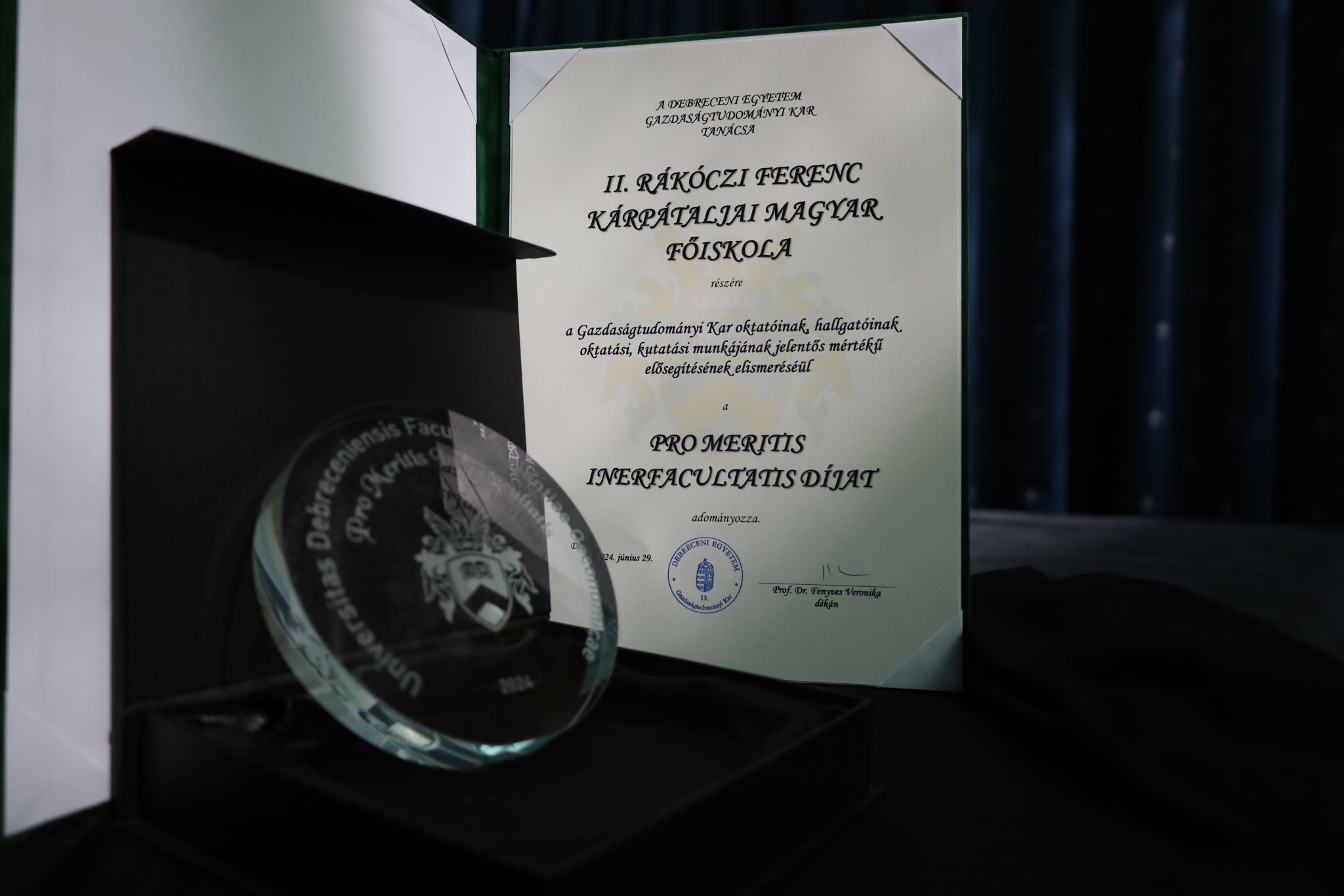 A Debreceni Egyetem (DE) Gazdaságtudományi Karának diplomaosztó ünnepségén nemcsak az oklevelek és különböző díjak kiosztására került sor, hanem rangos kitüntetések átadására is. A DE Gazdaságtudományi Karának Tanácsa Pro Meritis Interfacultatis Díjjal tüntette ki a II. Rákóczi Ferenc Kárpátaljai Magyar Főiskolát, amelyet Csernicskó István, a főiskola rektora vett át.
