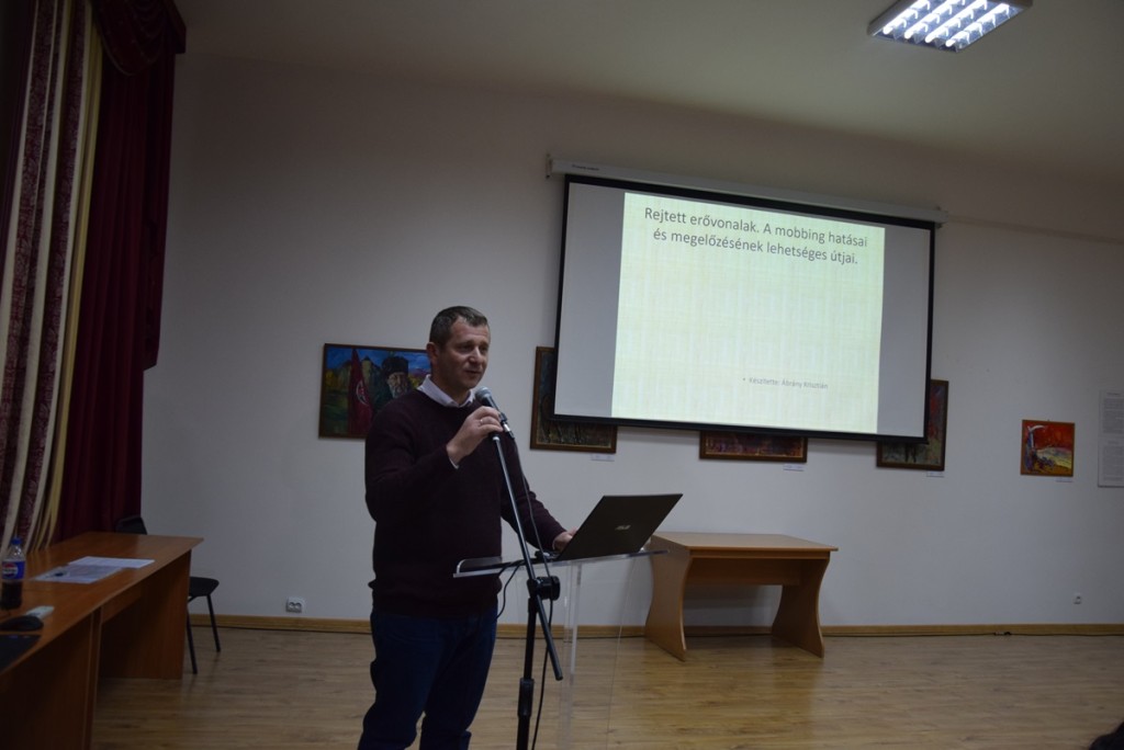 A köszöntőket követően Ábrány Krisztián görögkatolikus pap, mentálhigiénés szakember, a Pszichológiai Szakszolgálat munkatársa tartott előadást Rejtett erővonalak. A mobbing hatásai és megelőzésének lehetséges útjai címmel. Az előadó elsőként a konfliktus fogalmát tisztázta, kitérve annak okaira, fajtáira, területeire. Ezt követően meghatározta a mobbing fogalmát, amely egy olyan szituációra vonatkozik, amikor egy vagy több ember a munkahelyen ellenségesen viselkedik, inzultusokat követ el leggyakrabban csak egy munkavállalóval szemben. Ezek mellett a mobbing és konfliktus közötti különbséget is felfedte, hisz nem minden mobbing a konfliktus része, és nem minden mobbingtevékenység jelenik meg konfliktusként. Ezt követően rátért a mobbing kialakulásának okaira, folyamataira és következményeire.