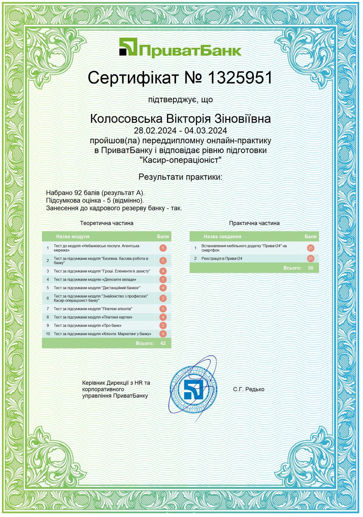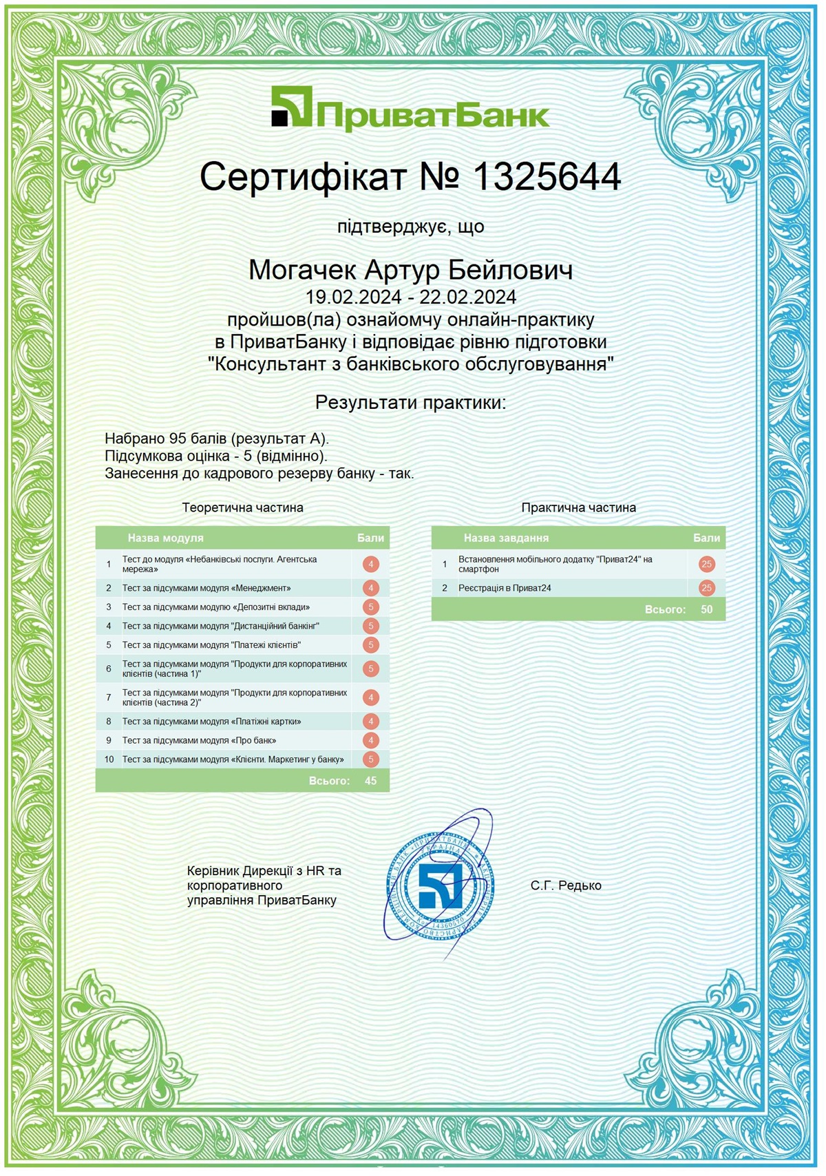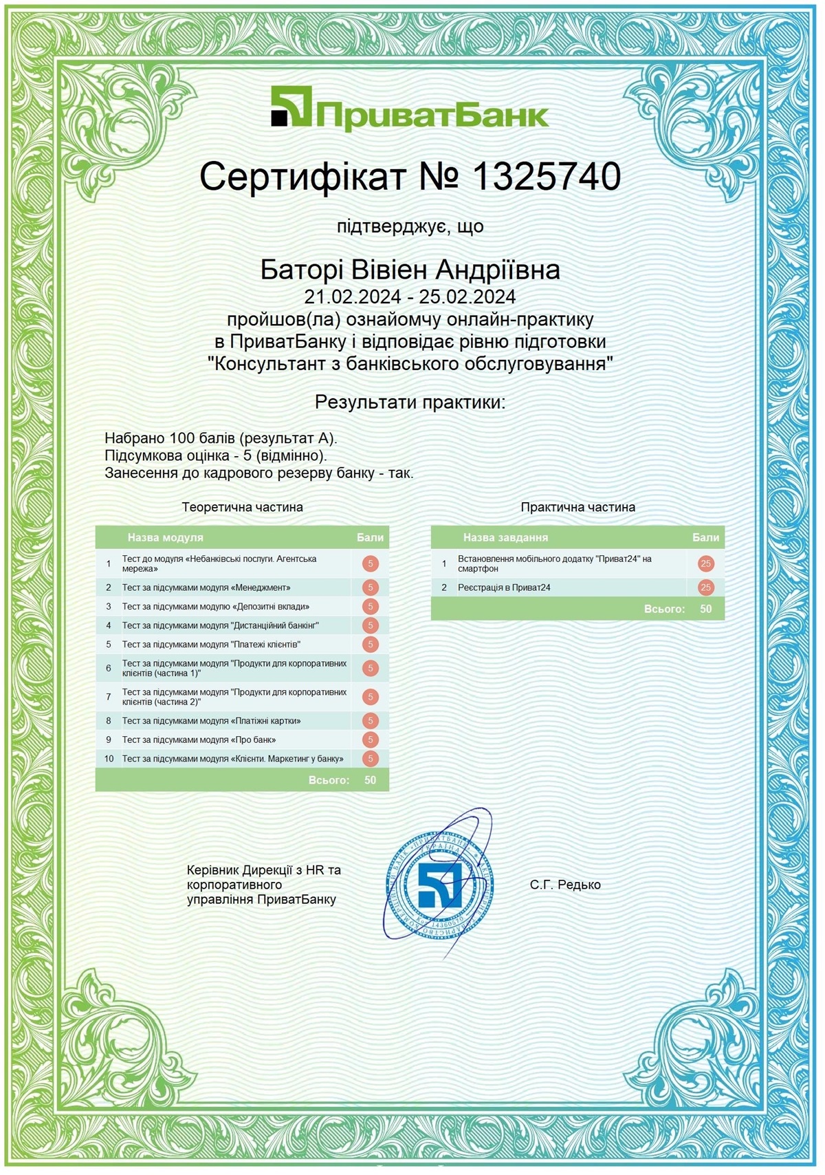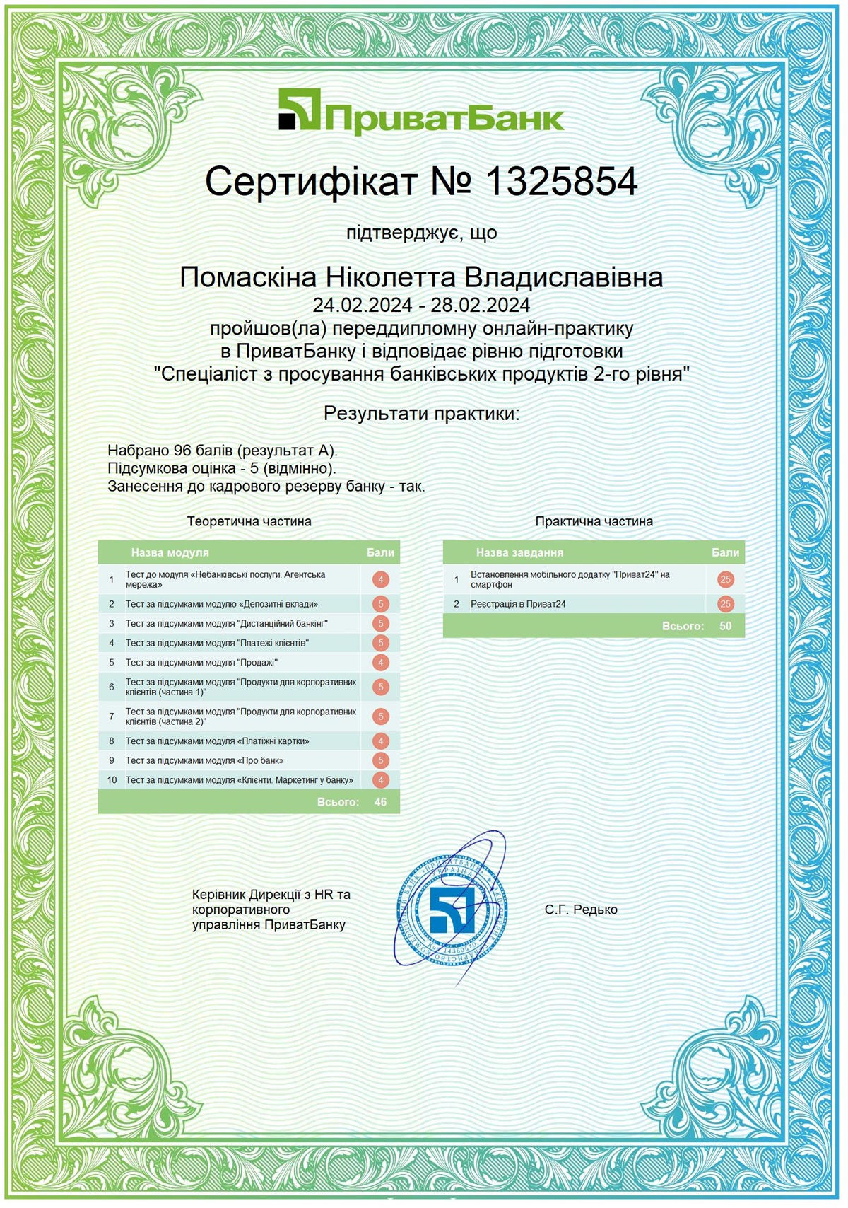 A gyakornokok a szakmai gyakorlat eredményei alapján magas szintű képzettséget tanúsító szertifikátot kaptak. A sikeres szakmai gyakorlat után a hallgatóknak lehetőségük van a PrivatBank Zrt.-nél dolgozni. A legjobb hallgatóink már bekerültek a bank személyzeti tartalék-adatbázisába.