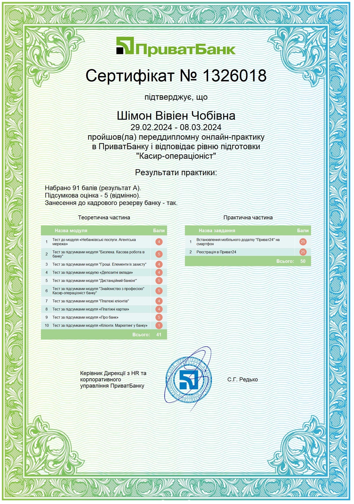 A számvitel és adóügy képzési program hallgatói a PrivatBank különféle online gyakorlati programjain vettek részt, nevezetesen: pénztár-operacionista, banki szolgáltatások tanácsadója, első szintű szakember a banki termékek promóciójában, második vonalú banki termékek népszerűsítésének specialistája.