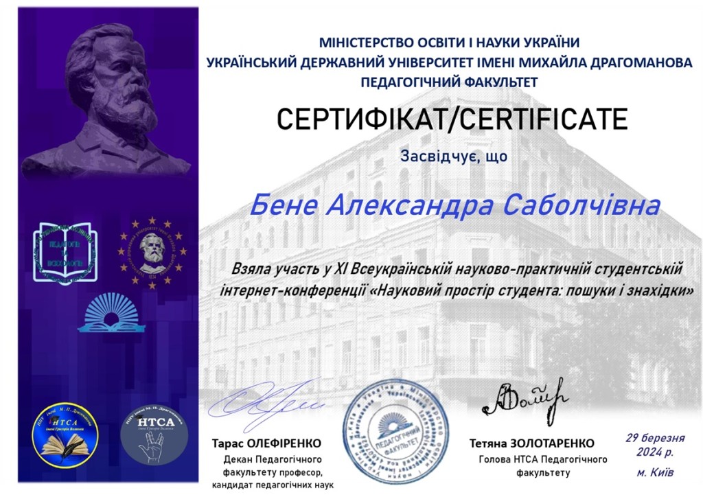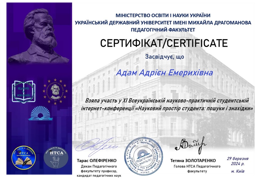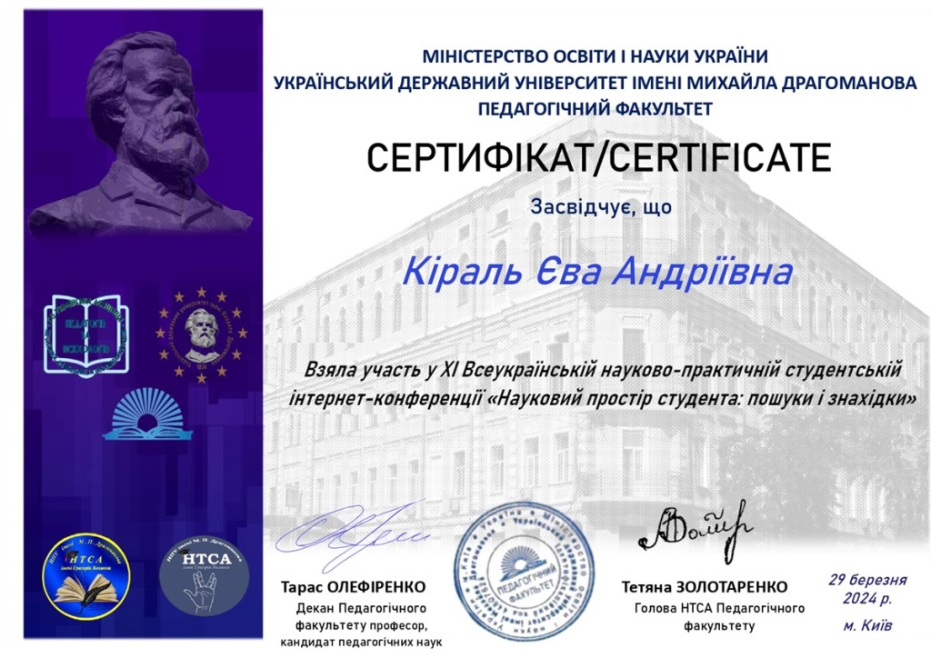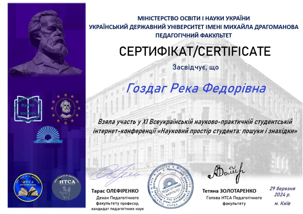 A Drahomanov Ukrán Állami Egyetem fennállásának 190. évfordulója alkalmából március 29-én diákok számára rendezett konferenciát, melynek témája A diák tudományos tere: lehetőségek és perspektívák. A konferenciának intézményünk is társszervezője volt.