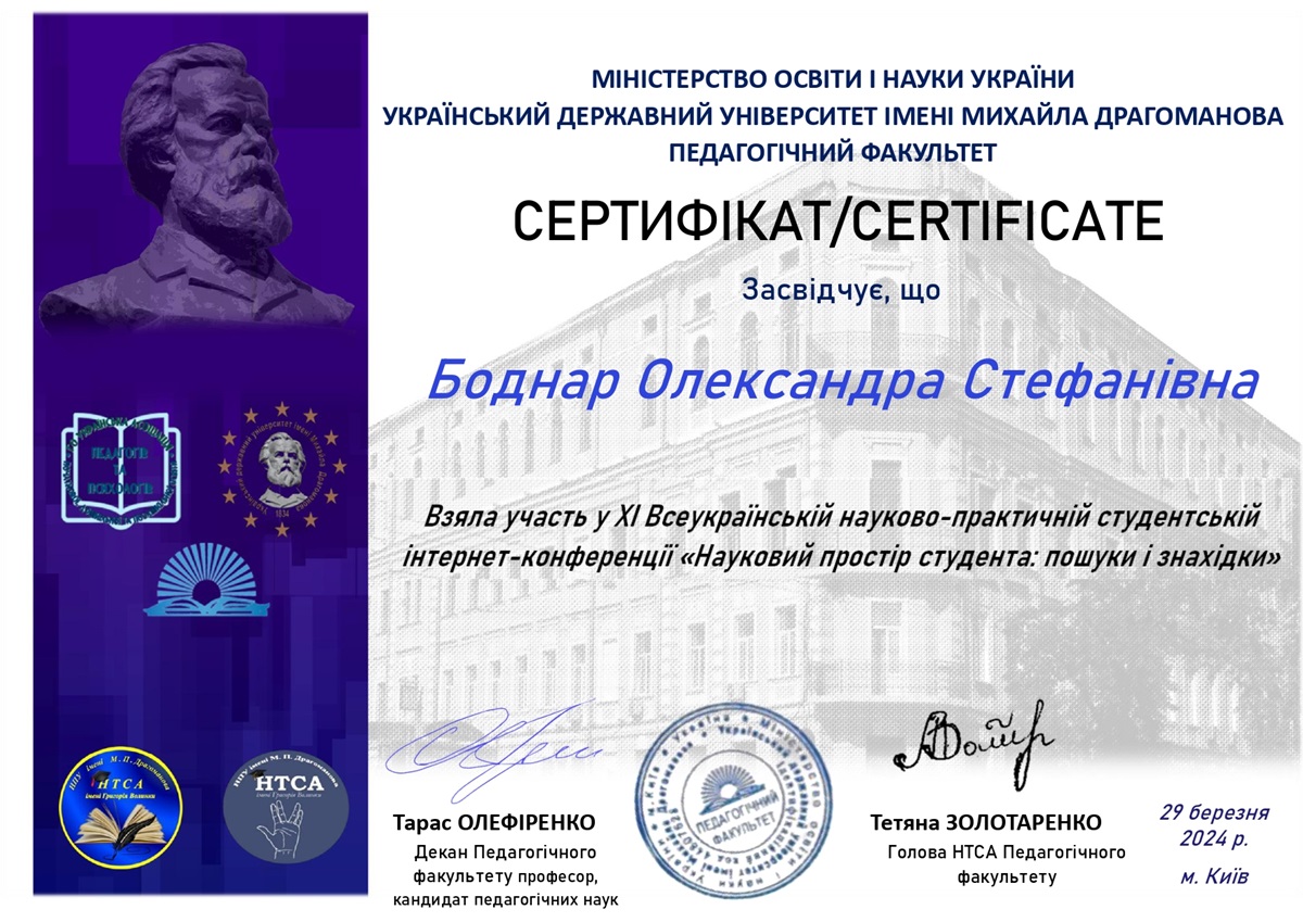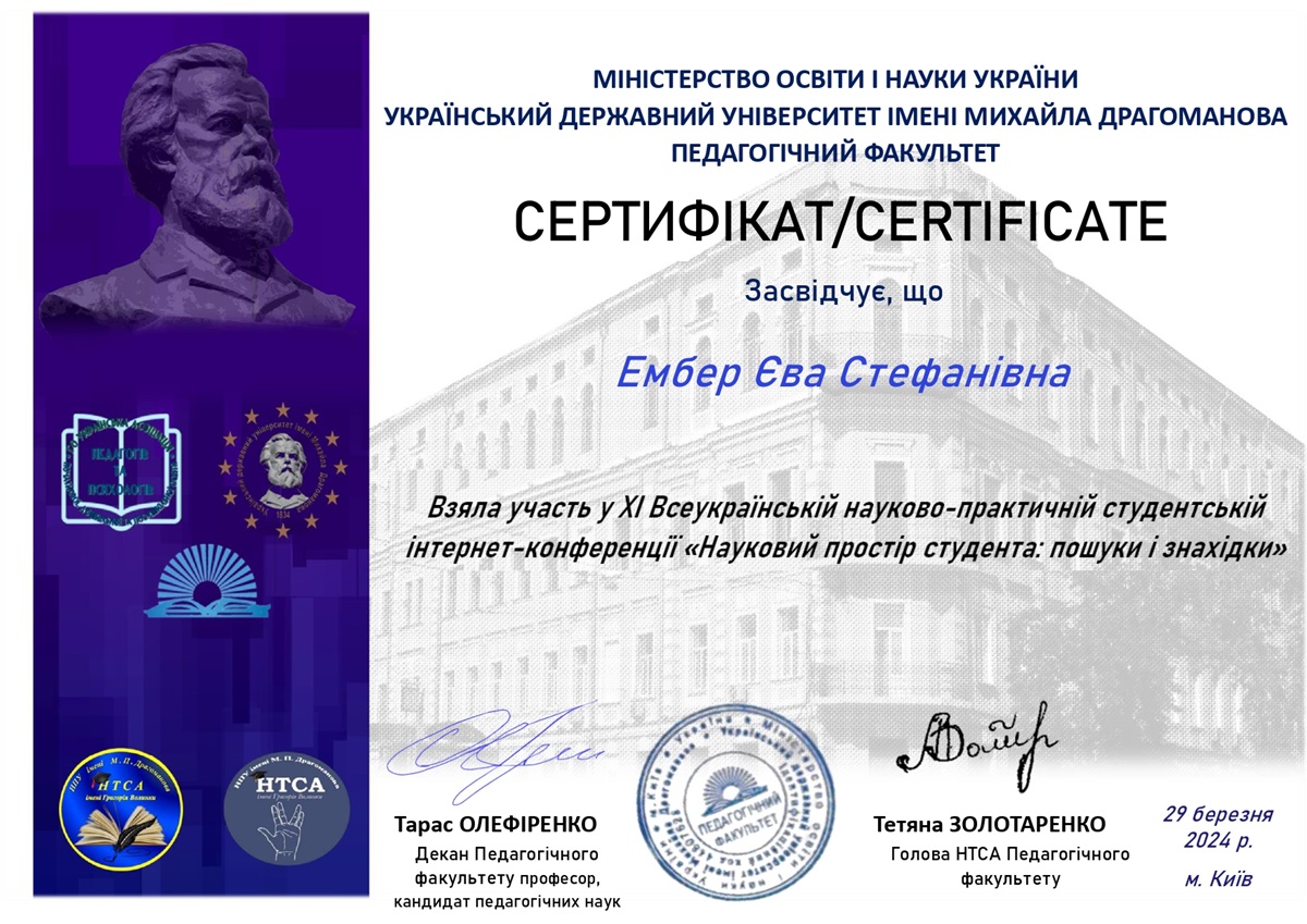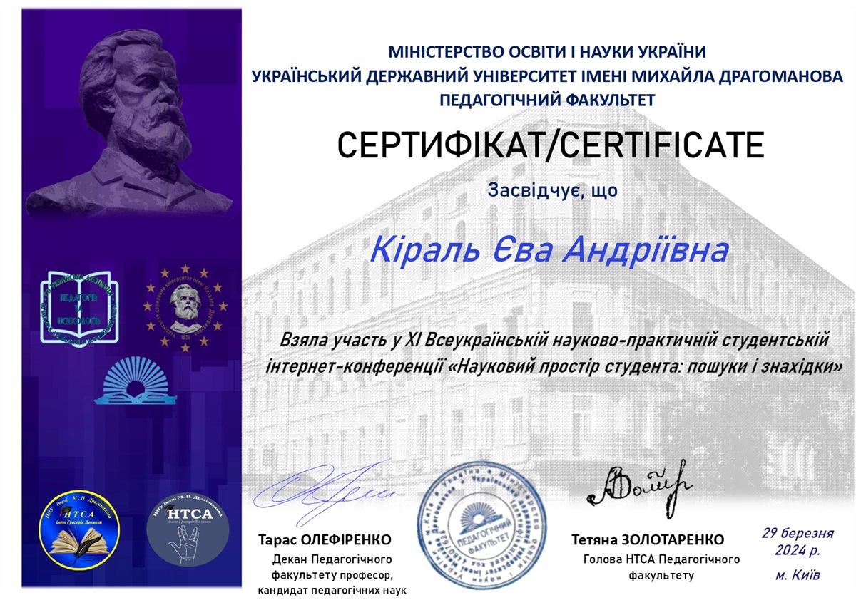 A Drahomanov Ukrán Állami Egyetem fennállásának 190. évfordulója alkalmából március 29-én diákok számára rendezett konferenciát, melynek témája A diák tudományos tere: lehetőségek és perspektívák. A konferenciának intézményünk is társszervezője volt.
