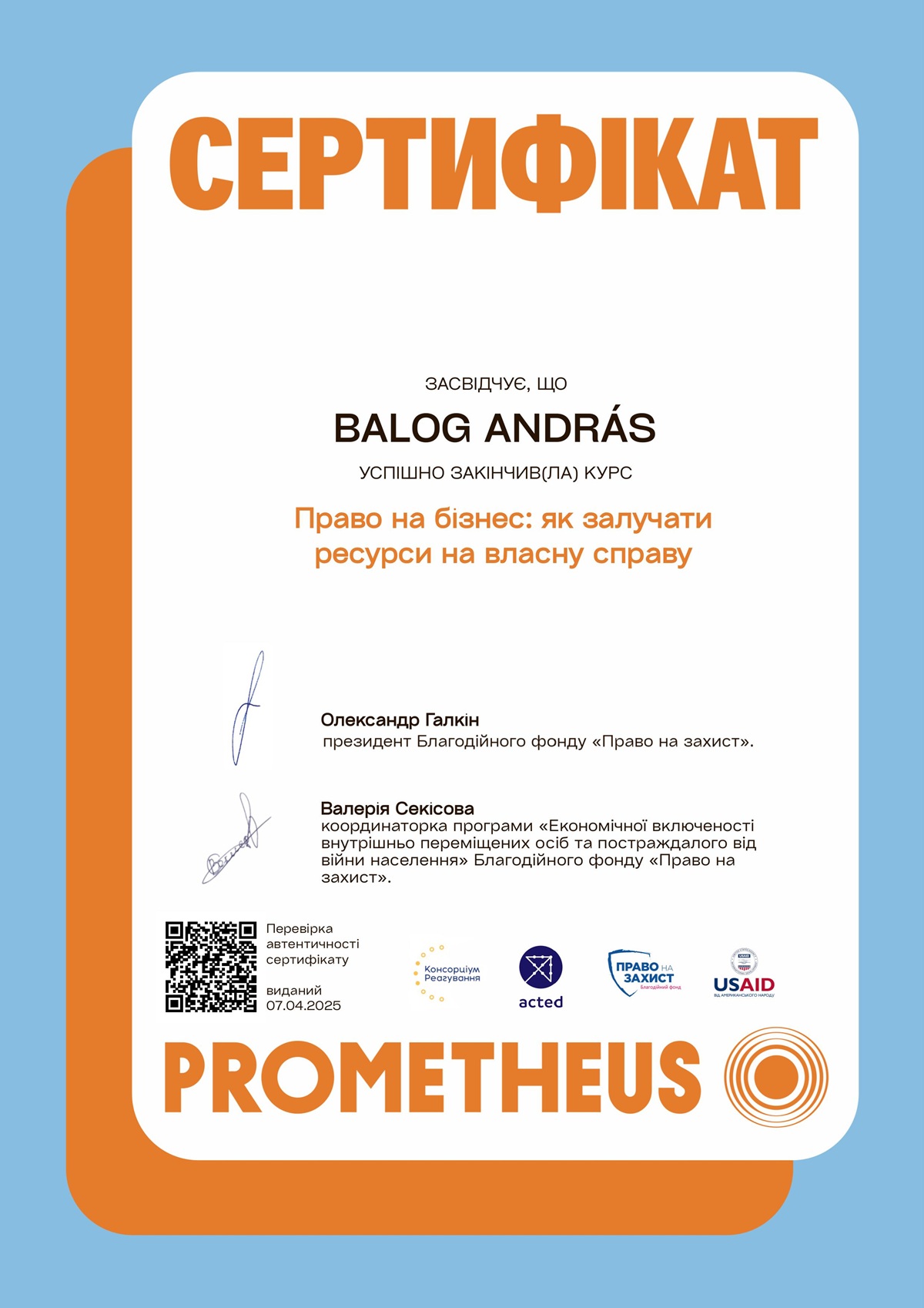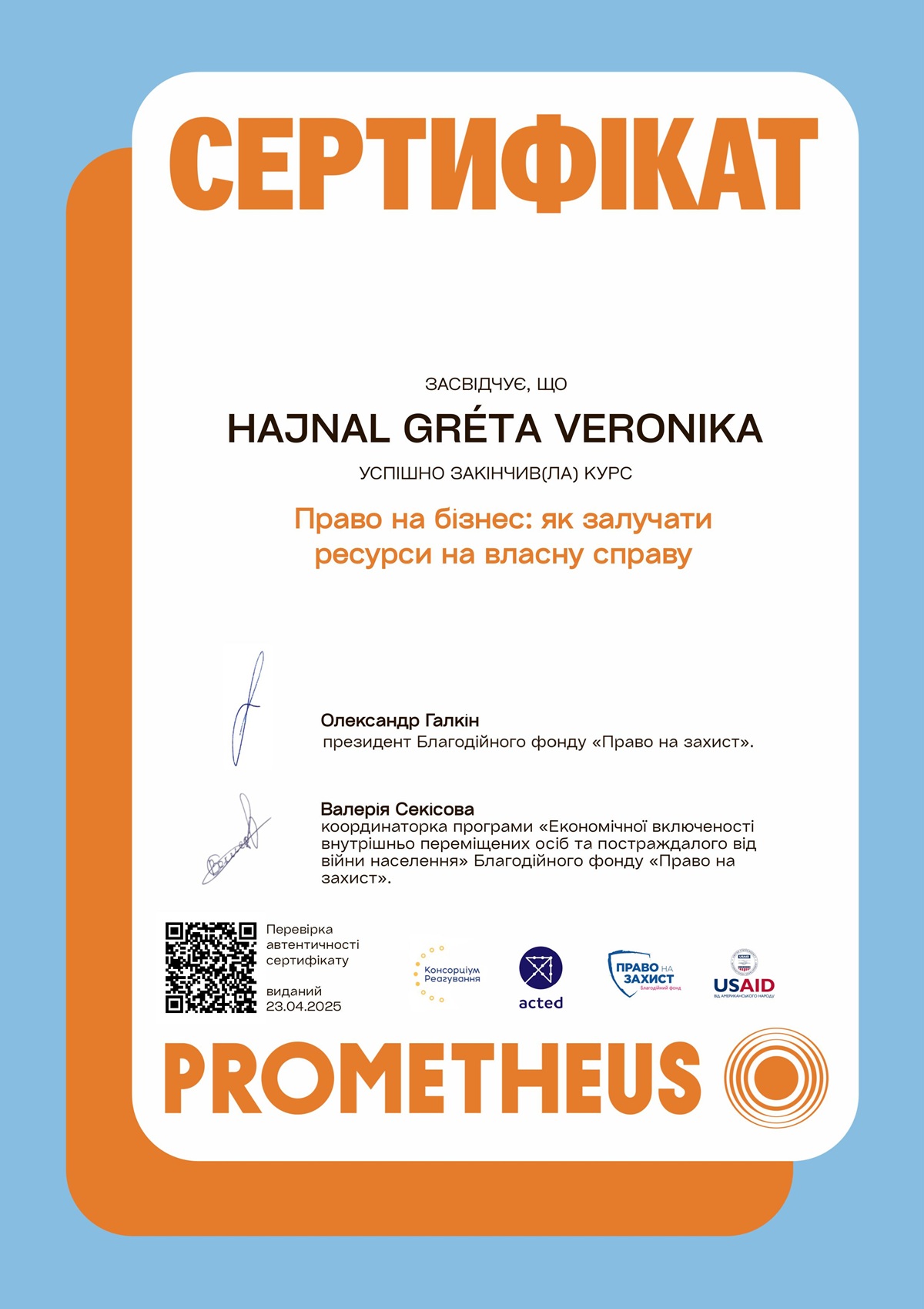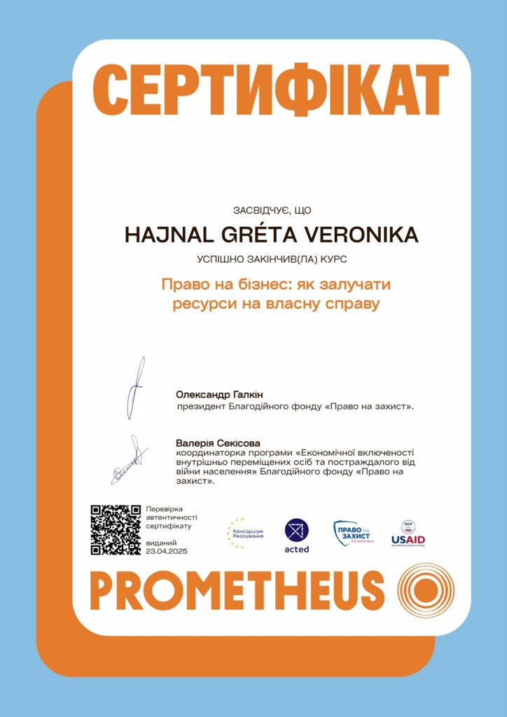 2025 április–májusában a Kisvállalkozások finanszírozása szabadon választható tantárgyat választó hallgatók sikeresen befejezték tanulmányaikat, és tanúsítványt kaptak Az üzlethez való jog: hogyan vonzzunk forrásokat saját vállalkozásunk számára? nevet viselő Prometheus-kurzusból.
