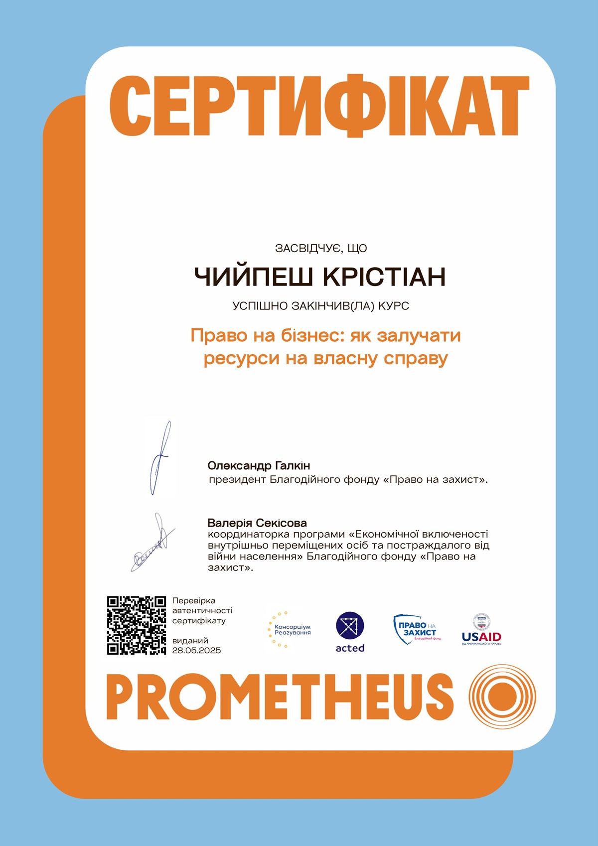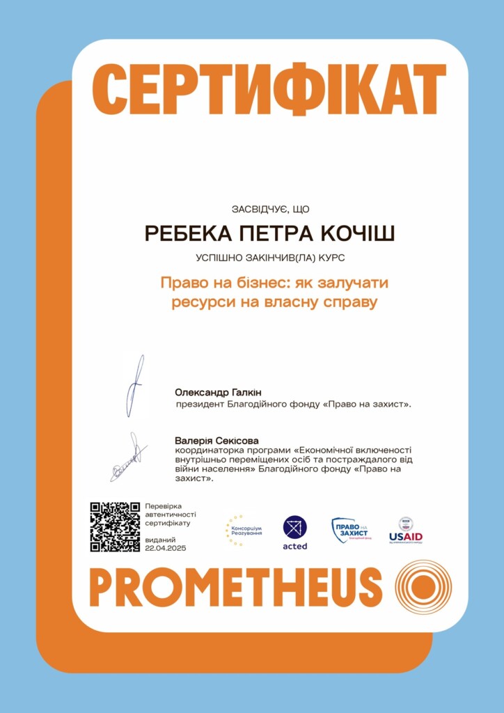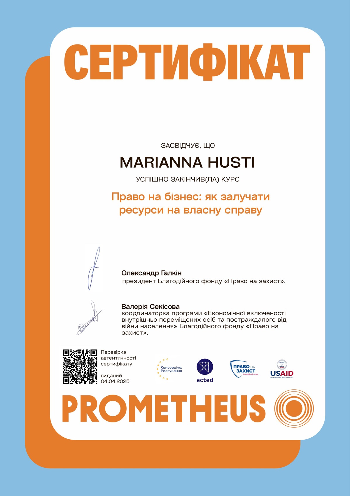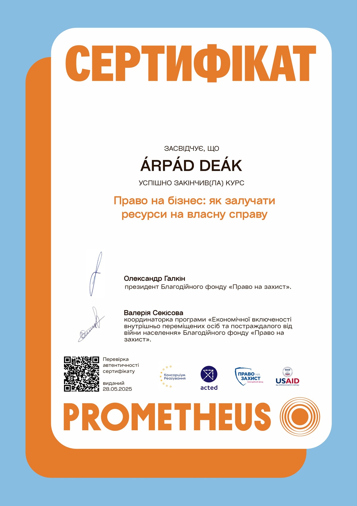 2025 április–májusában a Kisvállalkozások finanszírozása szabadon választható tantárgyat választó hallgatók sikeresen befejezték tanulmányaikat, és tanúsítványt kaptak Az üzlethez való jog: hogyan vonzzunk forrásokat saját vállalkozásunk számára? nevet viselő Prometheus-kurzusból.
