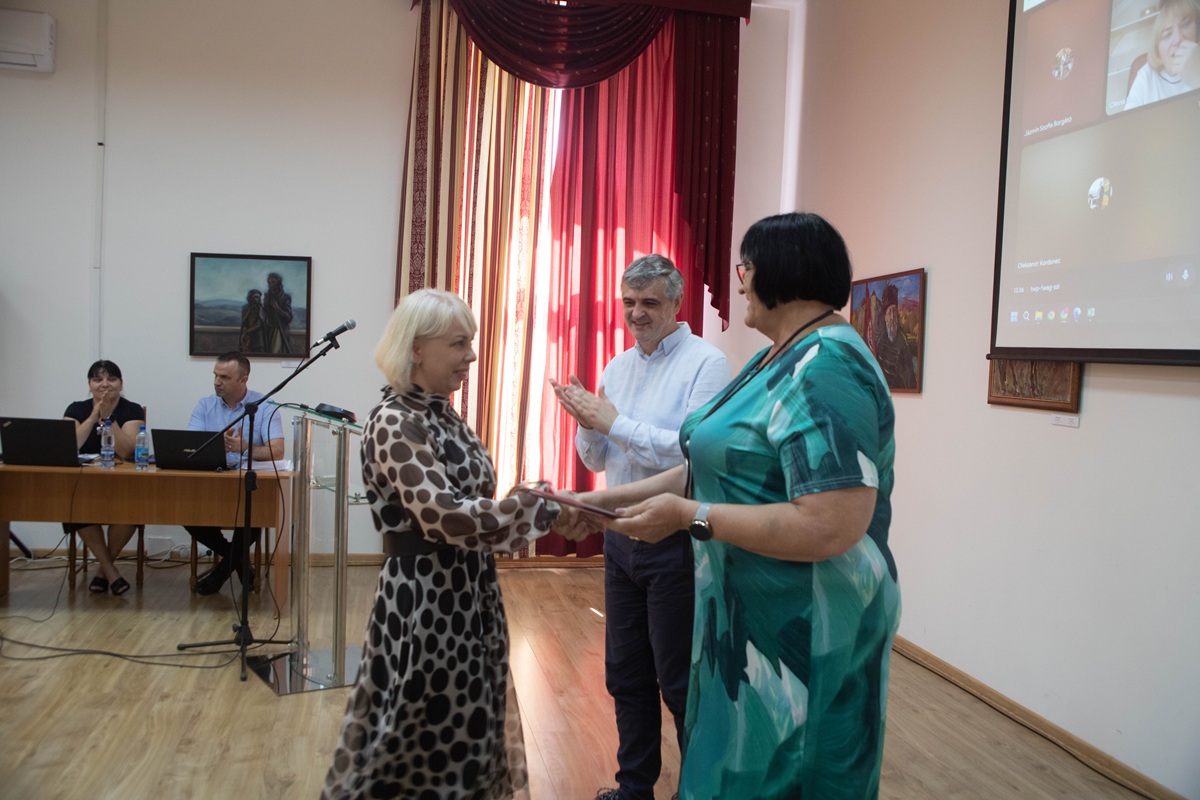 Az ülés utolsó szakaszában Makarovics Viktória, a Számvitel és Auditálás Tanszék oktatója átvette doktori (DSc) oklevelét intézményünk rektorától, Csernicskó Istvántól és a főiskola elnökétől, Orosz Ildikótól.