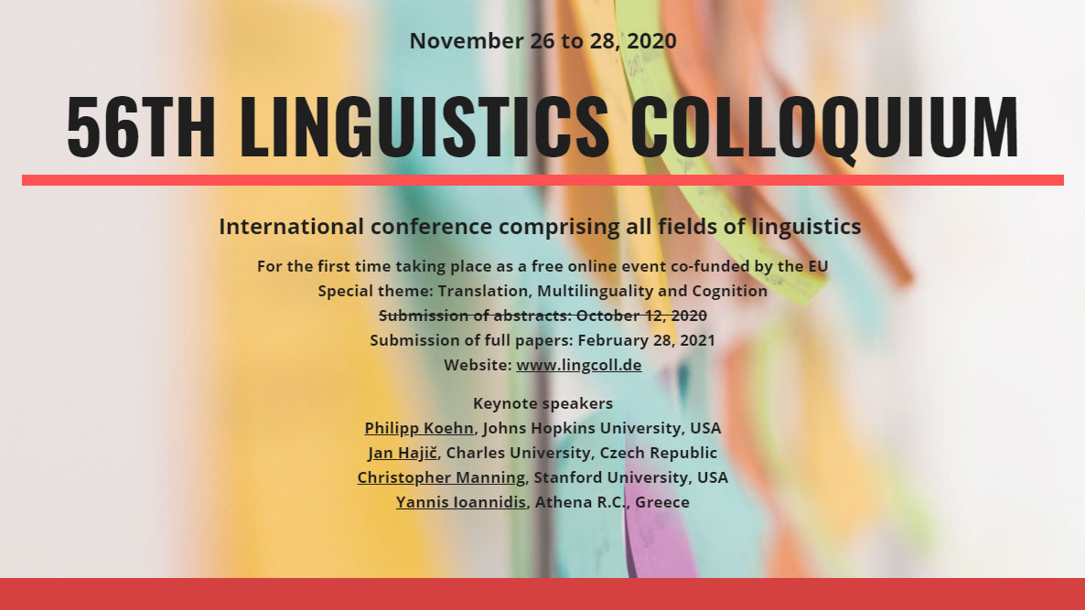 Nehéz időket élünk a COVID-19 járvány miatt, azonban a tudósvilág nem állt le, csak átvonult a digitális térbe. 2020. november 26-28. között rendezték meg az 56. Nyelvészeti Kolloquiumot a Magdeburg-Stendal-i Alkalmazott Tudományok Egyeteme szervezésében.