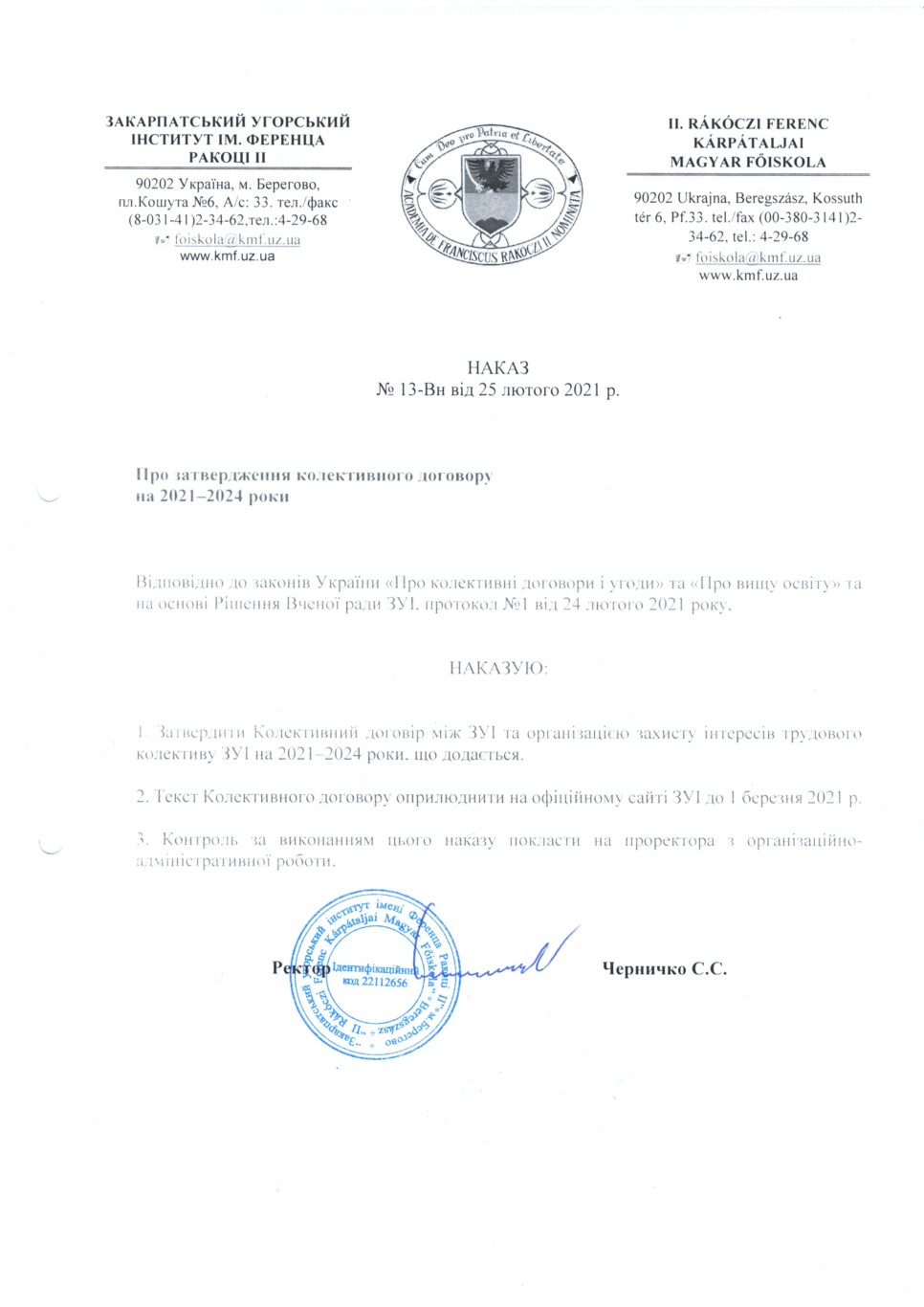 НАКАЗ № 13-Вн від 25.02.2021 р. “Про затвердження колективного договору на 2021-2024 роки”