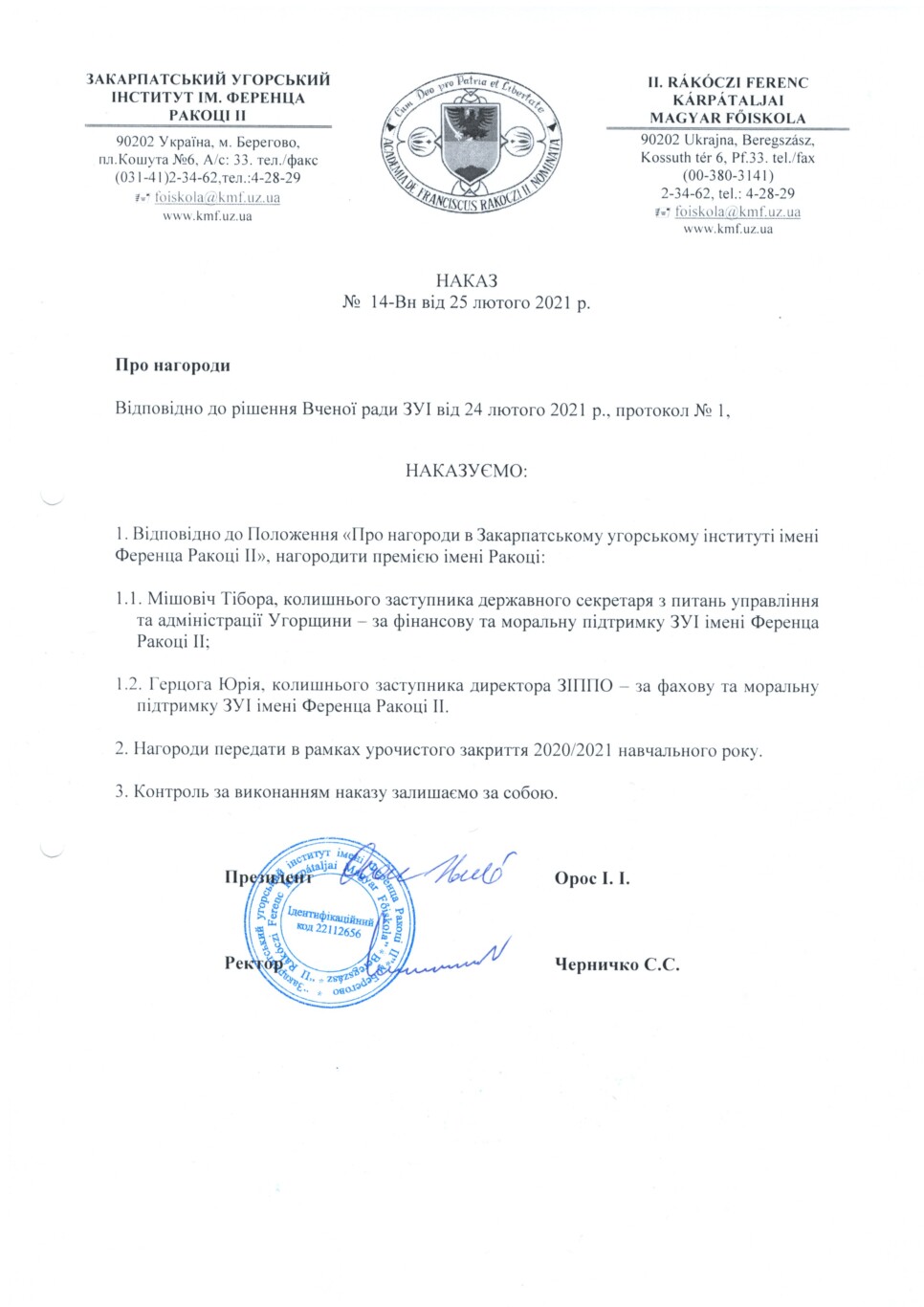НАКАЗ № 14-Вн від 25.02.2021 р. “Про нагороди”