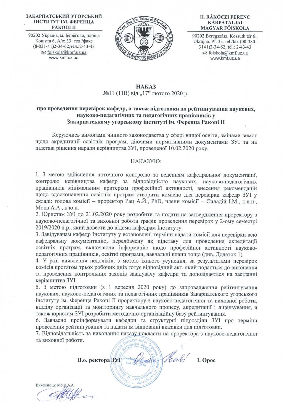 НАКАЗ № 11 (11В) від 17.02.2020 р. “Про проведення перевірок кафедр, а також підготовки до рейтингування наукових, науково-педагогічних та педагогічних працівників”
