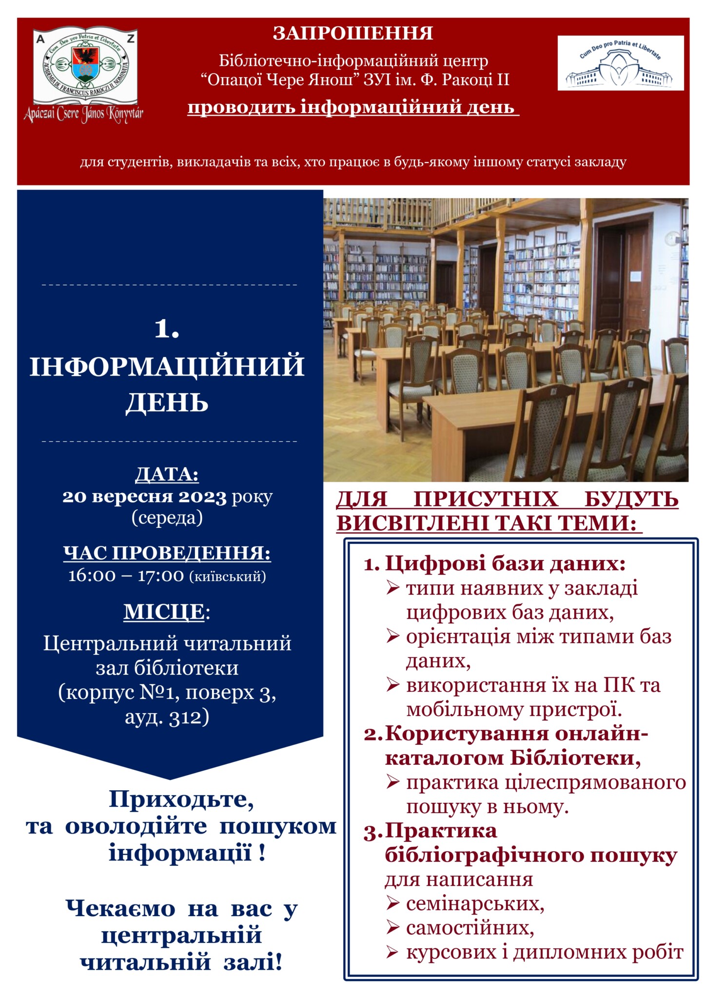 Бібліотечно-інформаційний центр “Опацої Чере Янош” ЗУІ ім. Ф. Ракоці ІІ (у відповідь на відгук наших читачів) проводить інформаційний день для студентів, викладачів та тих, хто працює в будь-якому іншому статусі закладу