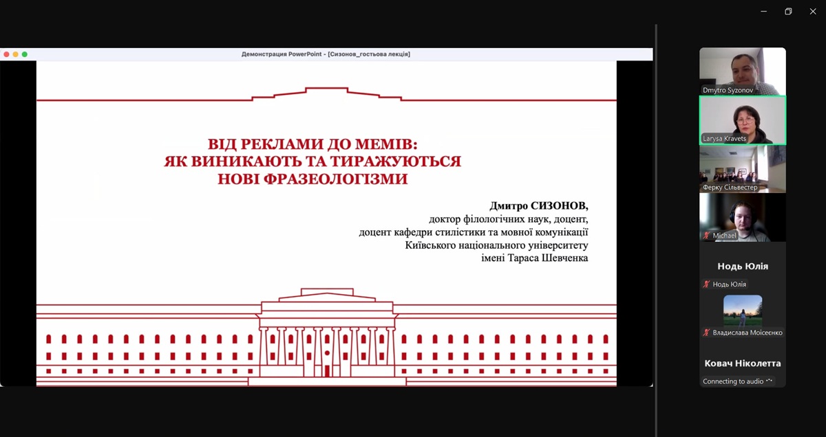 Гостьова лекція Дмитра Юрійовича Сизонова, доктора філологічних наук, доцента Київського національного університету імені Тараса Шевченка, на тему: «Від реклами до мемів: як виникають та тиражуються нові фразеологізми» для студентів-філологів.