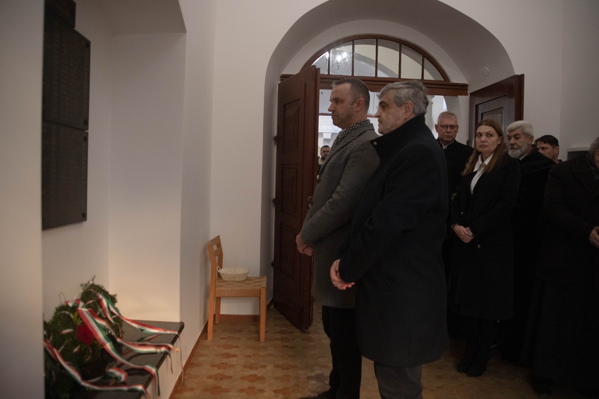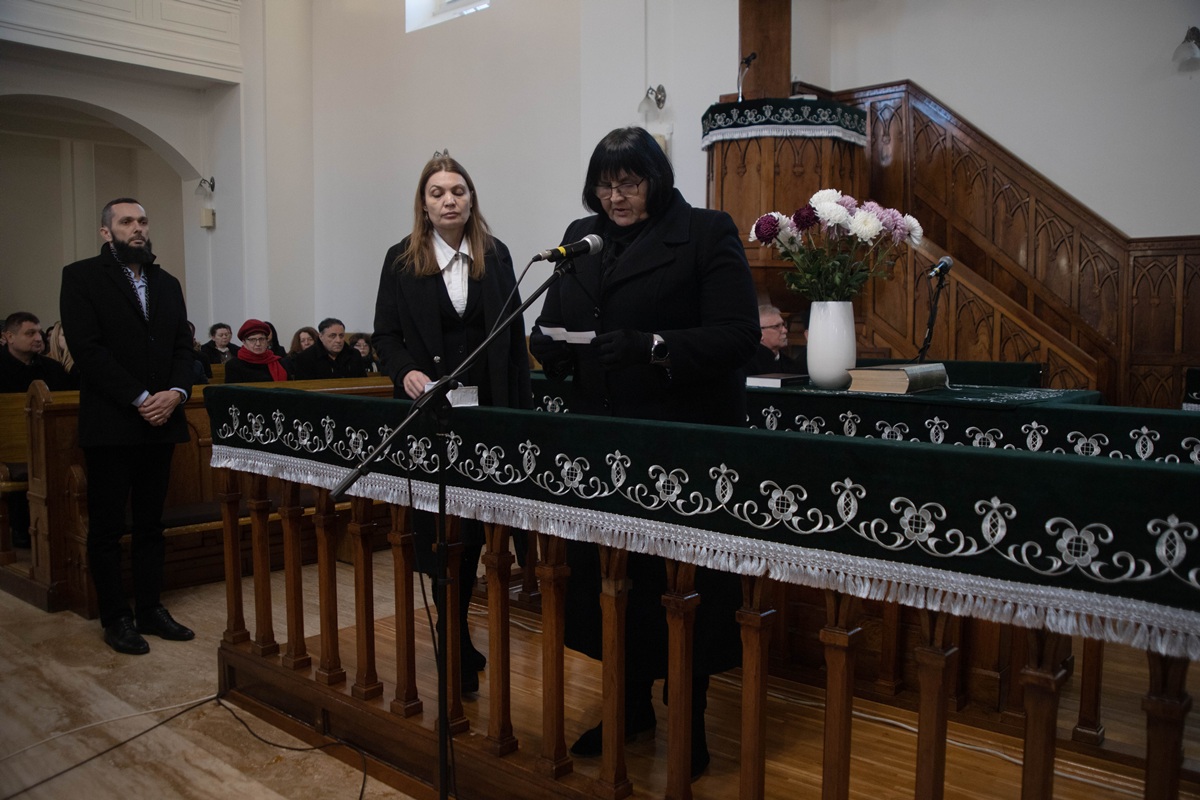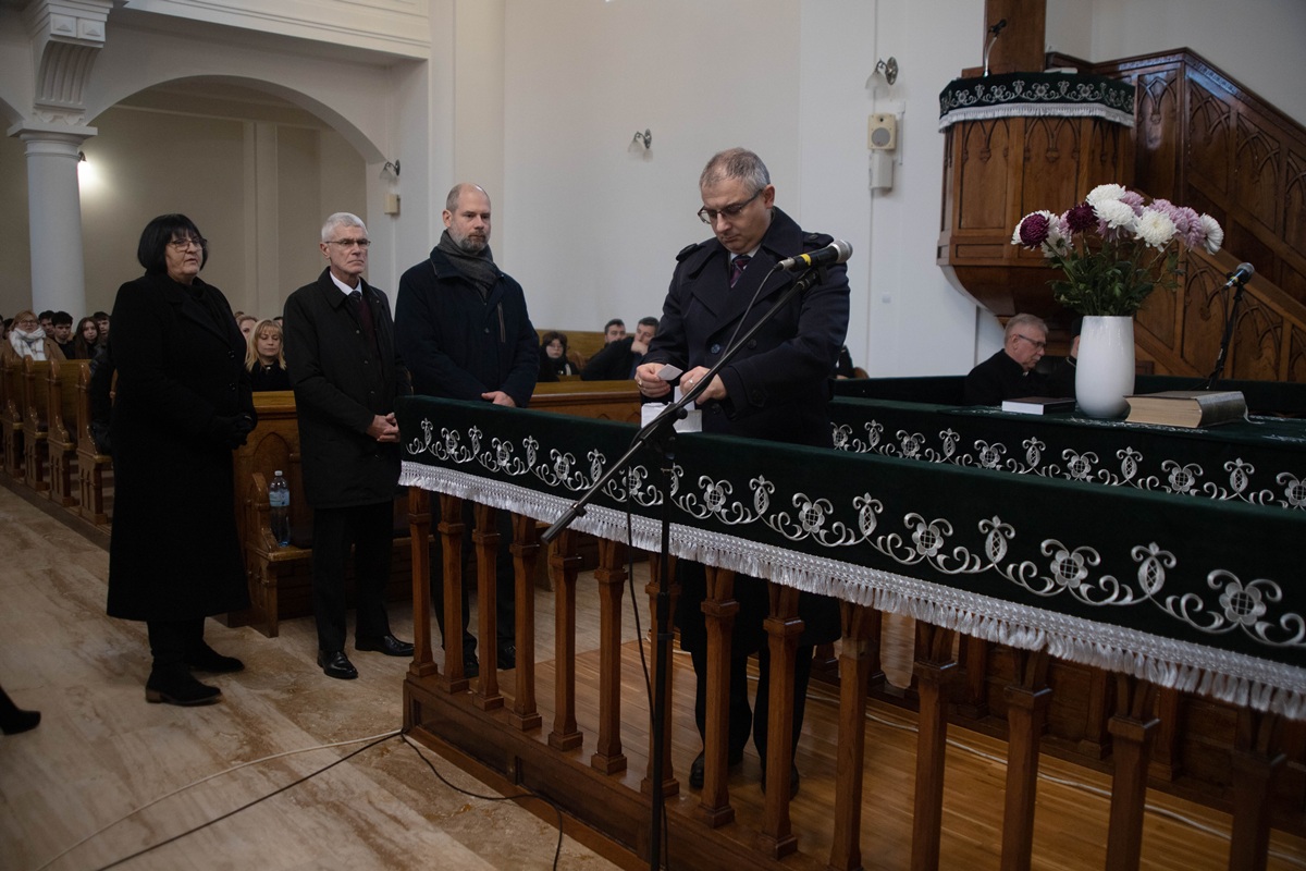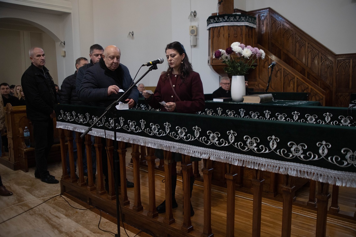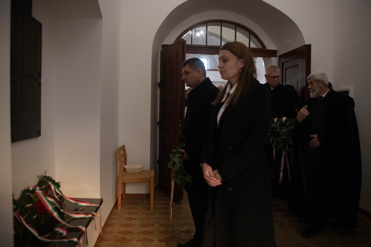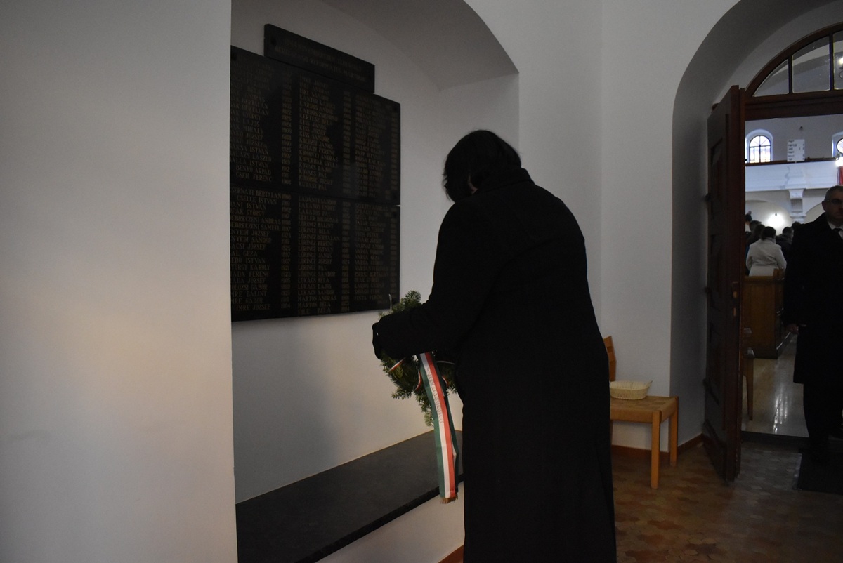 Після вітальної промови ректора присутні по черзі зачитали імена понад 300 жертв – уродженців Берегова, єдиним гріхом яких було те, що вони народилися угорцями, а потім поклали вінки пам’яті у вестибюлі реформатської церкви.