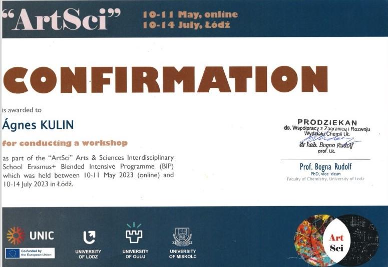 На практикумі (майстер-класі) «ArtSci», присвяченому взаємозв’язку між мистецтвом і наукою, який проходив завдяки програми Erasmus+ у м. Лодз у період з 10-11 травня 2023 р. (онлайн) та 10-14 липня 2023 р., Кулін Агнеш в рамках Змішаної Інтенсивної Програми (BIP) отримала визнання завдяки проведеному нею воркшопу.