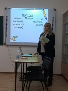 27 листопада 2025 року завідувачка кафедри української мови та методики її навчання Житомирського державного університету імені Івана Франка, кандидатка філологічних наук, доцентка Галина Іванівна Гримашевич у рамках дисципліни «Українська діалектологія» прочитала лекцію на тему «Лінгвальні риси поліського наріччя» для студентів-філологів бакалаврського та магістерського рівнів.