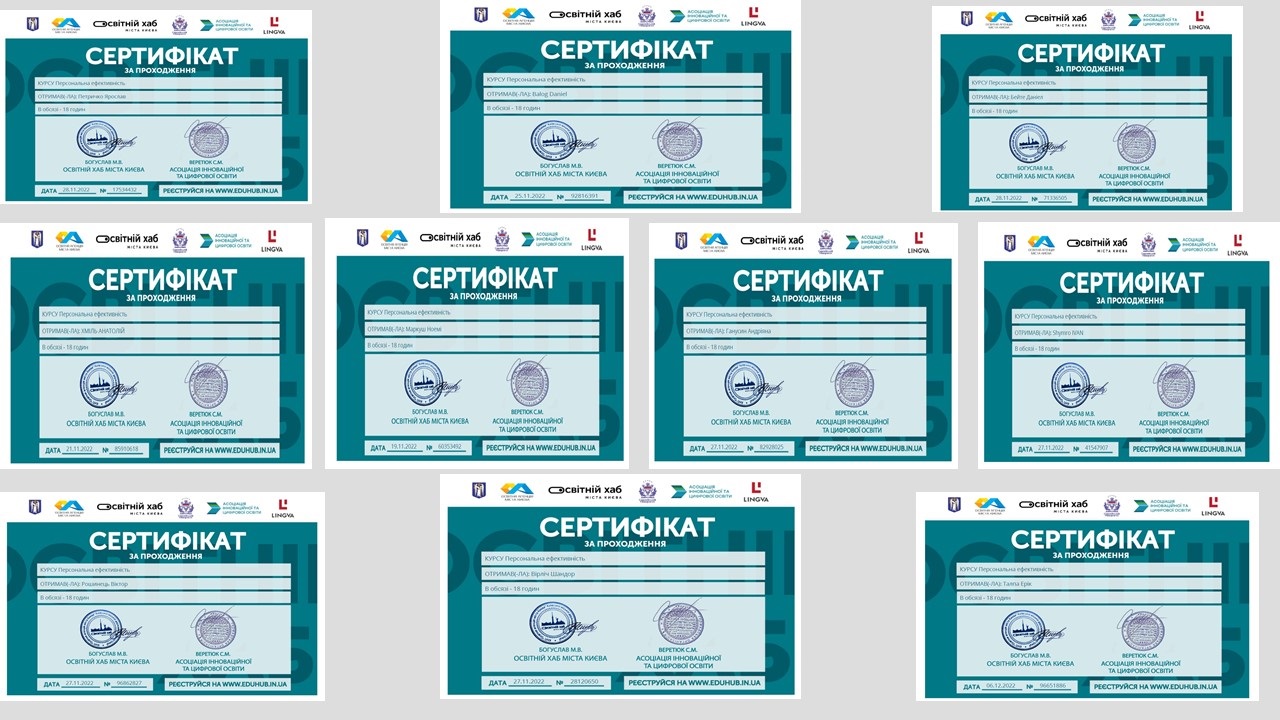 Здобувачі І курсу другого (магістерського) рівня вищої освіти освітньої програми «Міжнародний облік і оподаткування» пройшли онлайн-курс «Персональна ефективність» від соціального інноваційного проєкту “Освітній хаб міста Києва” у рамках вивчення навчальної дисципліни «Облікові процеси компанії».