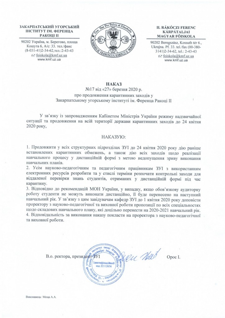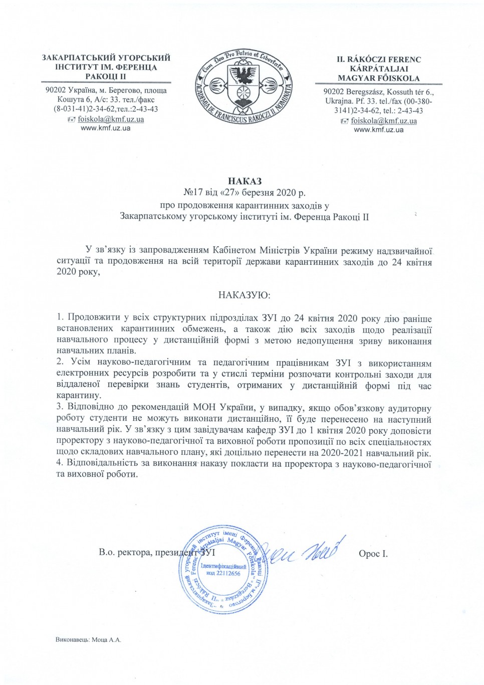 №17 від «27» березня 2020 р. про продовження карантинних заходів у Закарпатському угорському інституті ім. Ференца Ракоці ІІ