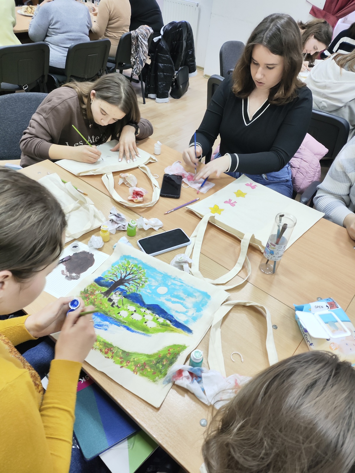 Під час практичної частини студенти розмальовували шопери, відкриваючи себе через малюнок і колір. Атмосфера була щирою, легкою та дружньою, наповненою взаємною підтримкою. Творчість об’єднала учасників і стала ефективним інструментом зняття напруги та формування психологічної стійкості. Адже, як нагадує нам арттерапія: «Мистецтво лікує тоді, коли мовчать слова».
