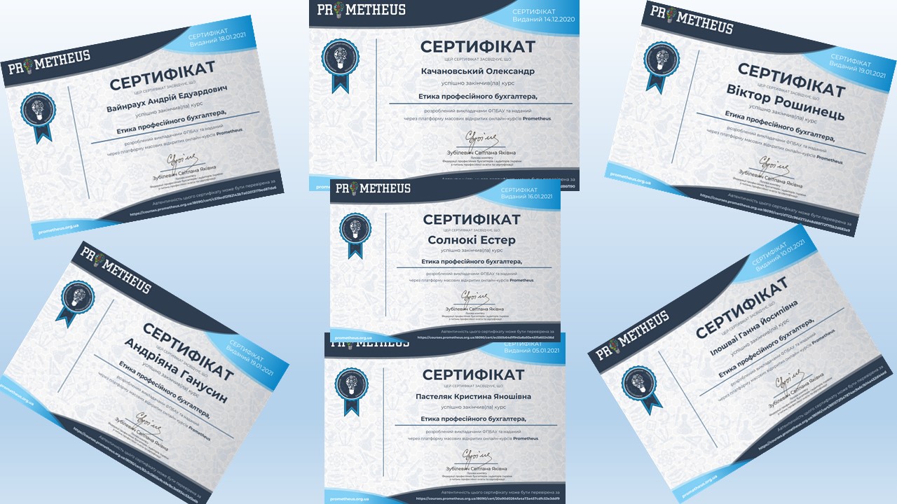 Отримання випускниками-обліковцями сертифікатів про проходження дистаційного онлайн-курсу «Етика професійного бухгалтера»