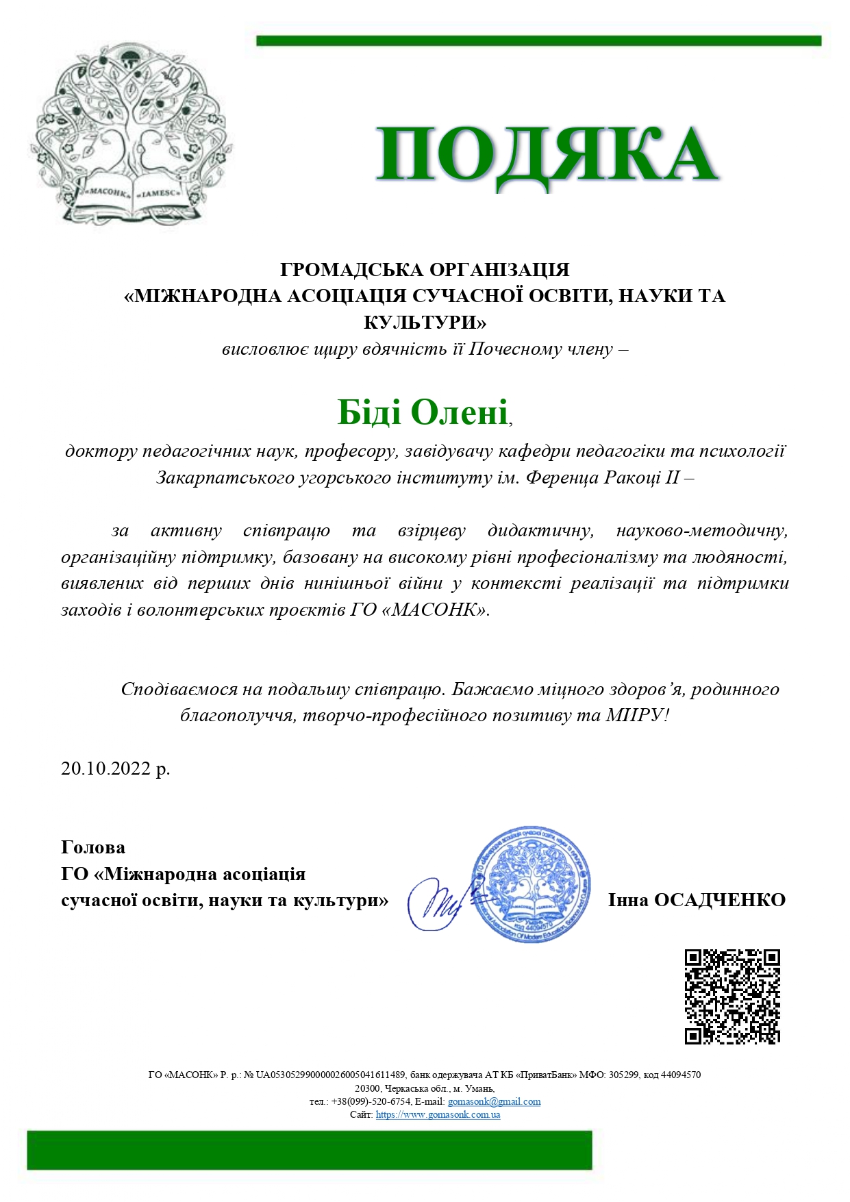 Завідувачка кафедри педагогіки та психології Біда Олена Анатоліївна отримала подяку за активну співпрацю та вагомий внесок у забезпечення реалізації заходів і проєктів ГО «МАСОНК».