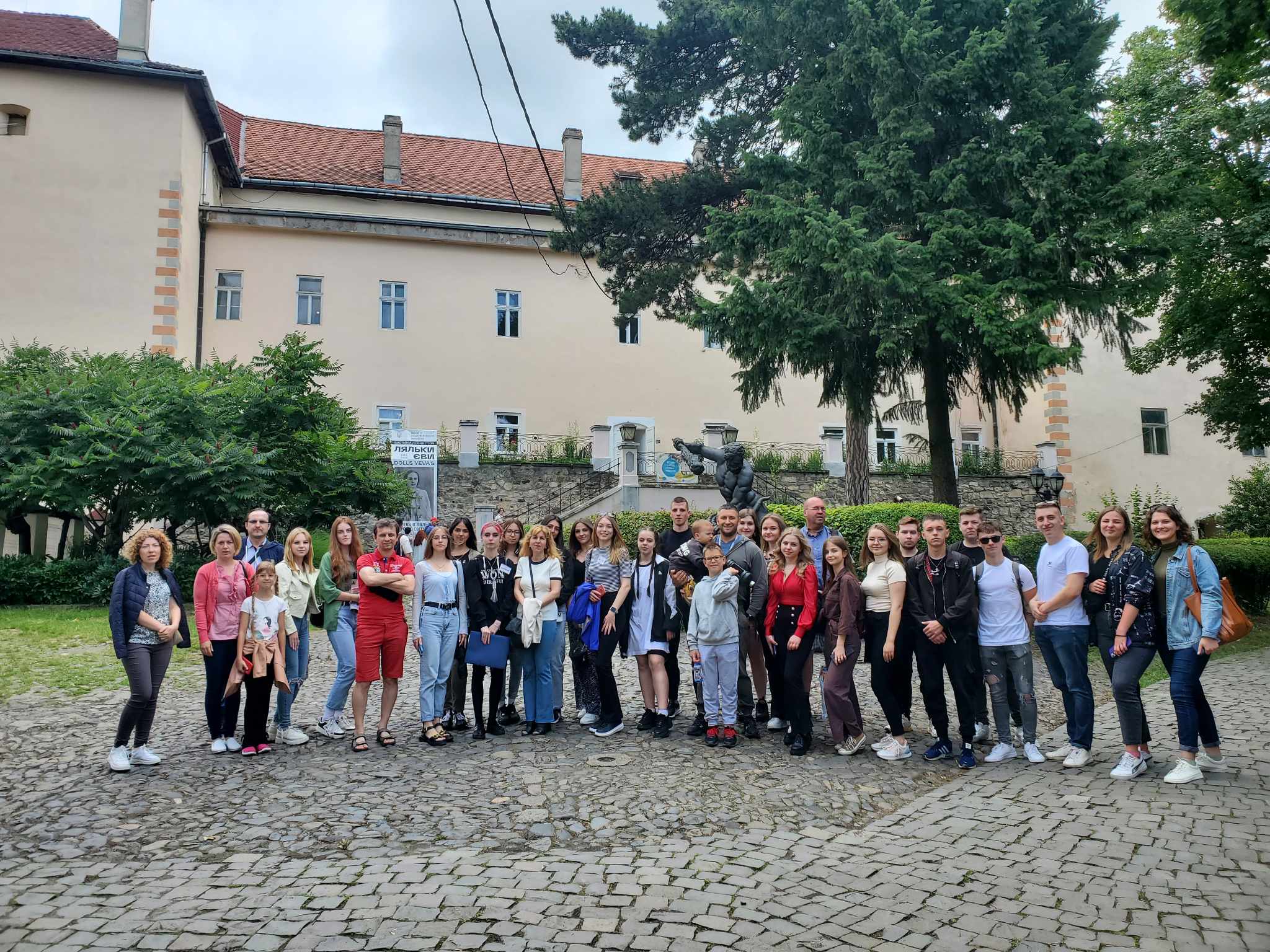 Першим нашим пунктом призначення був Ужгородський замок. Вікторія Тобіаш (студентка 3 курсу спеціальностей «Англійська мова і література» та «Туризм») і Богларка Герив (студентка 1 курсу спеціальності «Англійська мова і література» та 2 курсу спеціальності «Туризм») познайомили нас із замком, і детально розповіли на англійській мові про важливість регіону та Ужгорода, як туристичний центр, і як адміністративний центр Закарпаття.