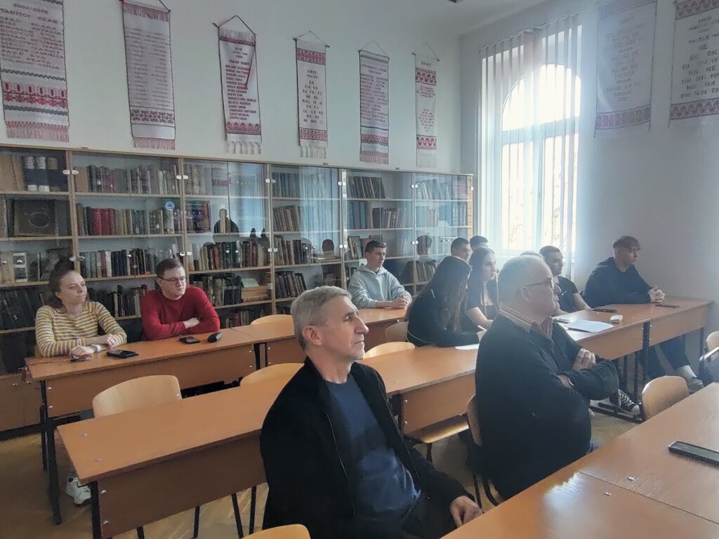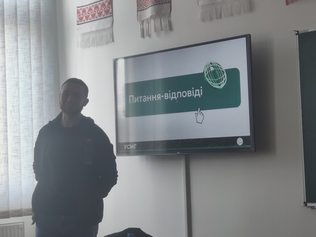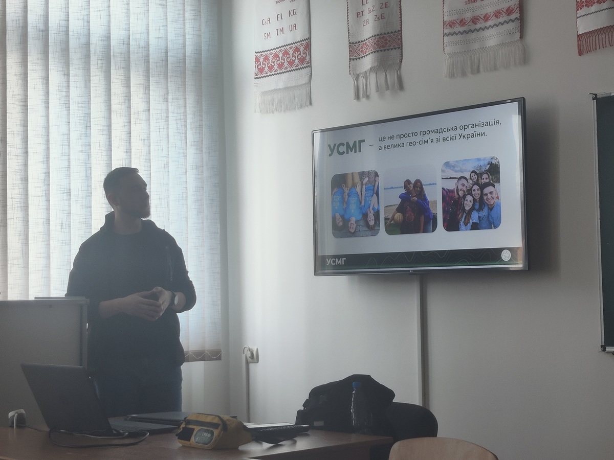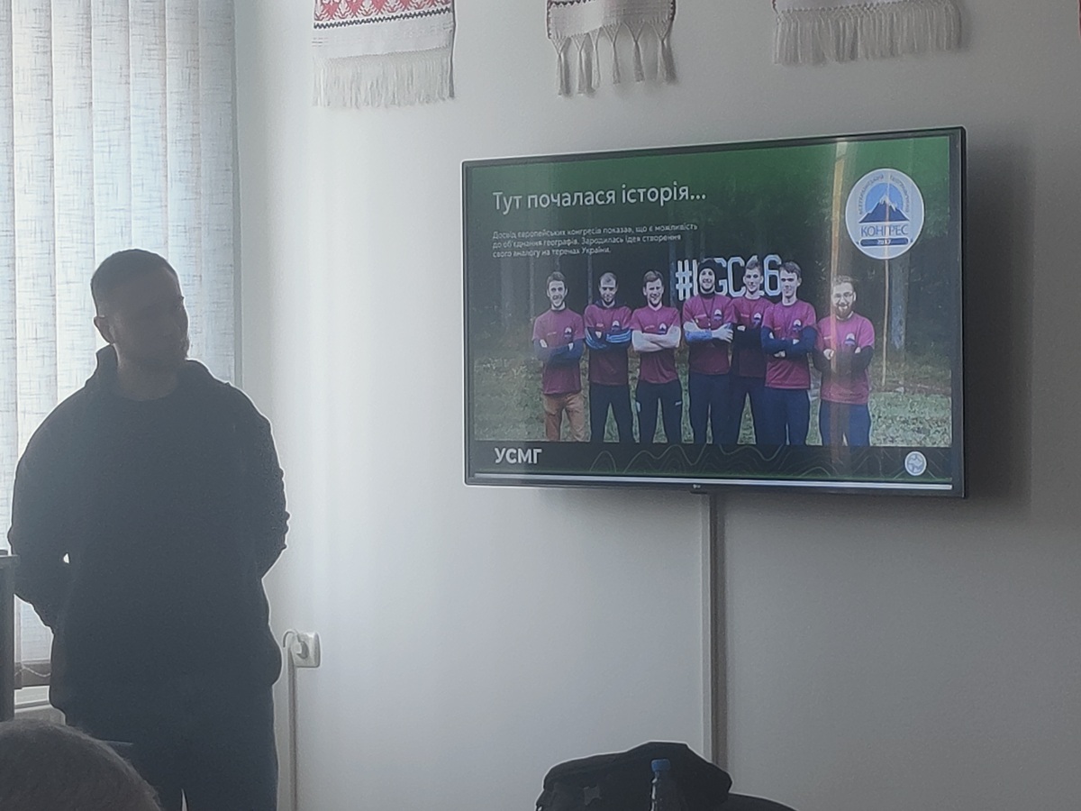 Під час презентації він розказував про історію заснування УСМГ, основні напрямки діяльності та важливість сучасної географічної науки та освіти для України.