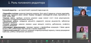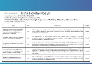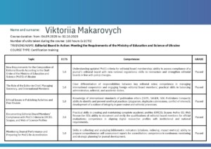 Значна увага була приділена питанням розподілу функцій головного редактора, відповідального секретаря та іноземних членів, налагодженню ефективної комунікації між редакцією, авторами та рецензентами, а також сучасним практикам організації редакційної роботи відповідно до міжнародних стандартів. Окремий модуль був присвячений питанням академічної доброчесності, протидії плагіату, формуванню етичних політик та стандартів рецензування. Участь представників журналу в цьому курсі сприяла поглибленню знань щодо сучасних вимог до редакційної діяльності, підвищенню якості управління редакційними процесами, удосконаленню механізмів документування та етичної взаємодії в науковому середовищі. Отримані знання та інструменти дозволять ефективніше організовувати роботу редколегії, забезпечувати прозорість процедур рецензування і підвищувати міжнародний рівень журналу Acta Academiae Beregsasiensis. Economics.