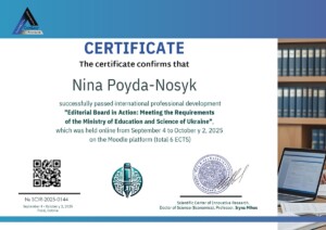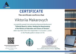 З 4 вересня по 2 жовтня 2025 року представники редакційної колегії наукового журналу Acta Academiae Beregsasiensis. Economics, д.е.н., проф. Ніна Никифорівна Пойда-Носик та д.е.н., доцент Вікторія Костянтинівна Макарович, брали участь у міжнародному курсі підвищення кваліфікації «Редакційна колегія в дії: як організувати роботу редколегії журналу відповідно до нових вимог МОН».