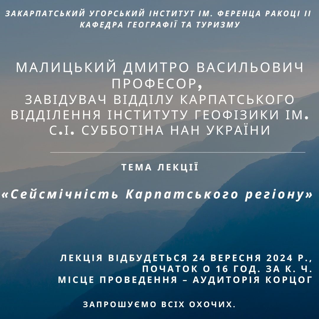 24 вересня 2024 року о 16 год. за к. ч. в аудиторії Корцог Закарпатського угорського інституту імені Ференца Ракоці ІІ проводитиметься лекція Малицького Дмитра Васильовича, доктора фізико-математичних наук, професора, завідувача відділу Карпатського відділення Інституту геофізики ім. С.І. Субботіна НАН України.